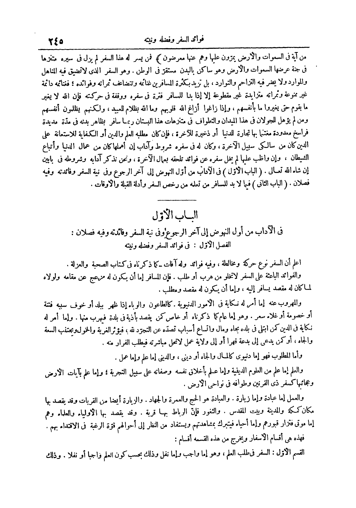 الباب الثاني فيما لَا بُدَّ لِلْمُسَافِرِ مِنْ تَعَلُّمِهِ مِنْ رُخَصِ السفر وأدلة القبلة والأوقات الباب الأول في الآداب من أول النهوض إلى آخر الرجوع وفي نية السفر وفائدته وفيه فصلان الفصل الأول في فوائد السفر وفضله ونيته