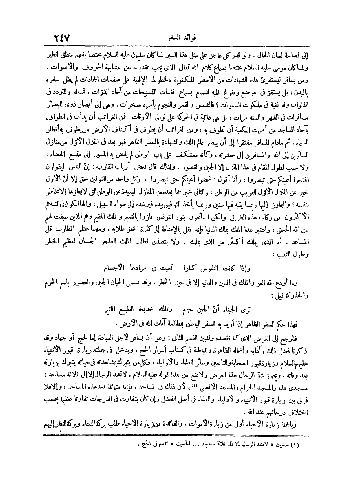 ويجوز شد الرحال لهذا الغرض ولا يمنع من هذا قوله صلى الله عليه وسلم لا تشد الرجال إِلَّا إِلَى ثَلَاثَةِ مَسَاجِدَ مَسْجِدِي هَذَا وَالْمَسْجِدِ الحرام والمسجد الأقصى (¬1)