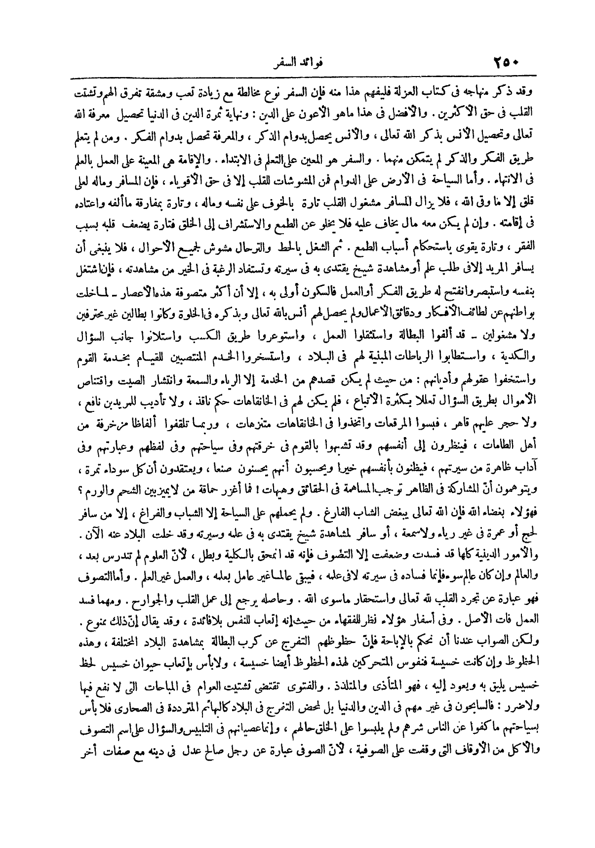 ولم يحملهم على السياحة إلا الشباب والفراغ إلا من سافر لحج أو عمرة في غير رياء ولا سمعة أو سافر لمشاهدة شيخ يقتدي به في علمه وسيرته وقد خلت البلاد عنه الآن