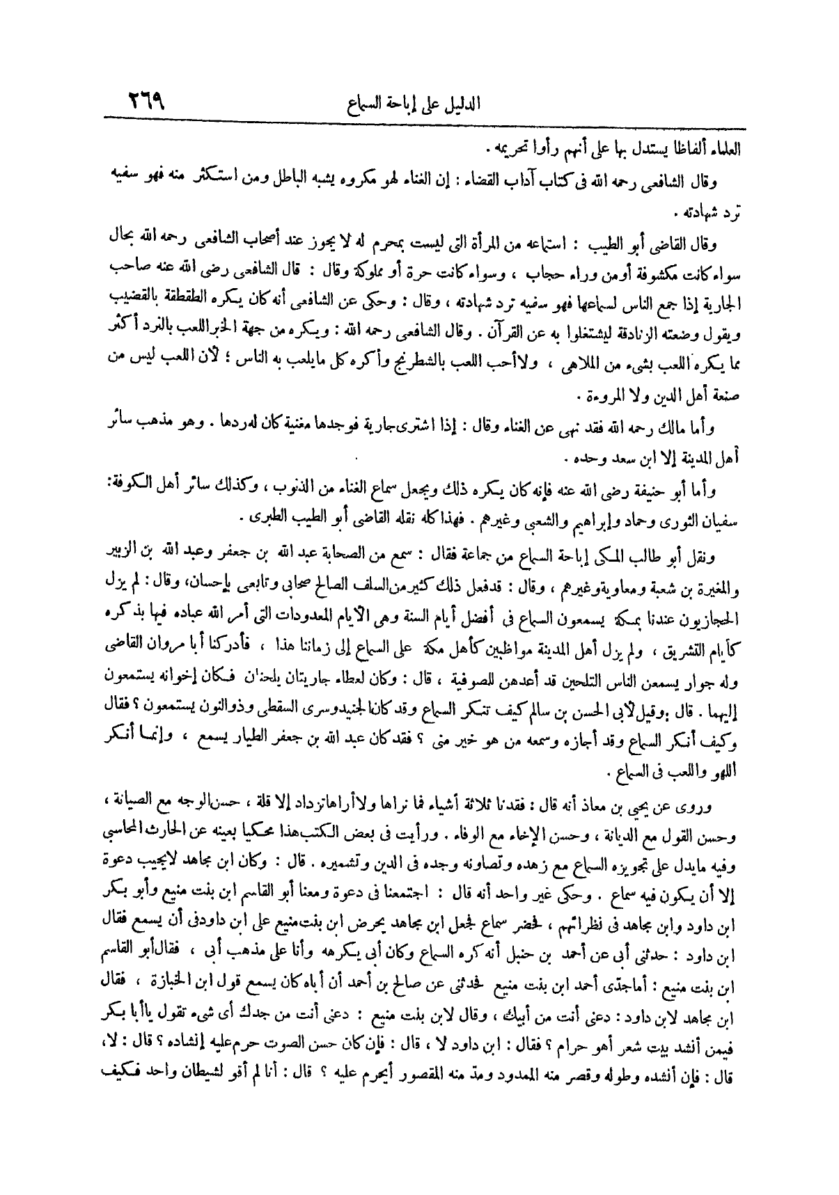 ونقل أبو طالب المكي إباحة السماع من جماعة فقال سمع من الصحابة عبد الله بن جعفر وعبد الله بن الزبير والمغيرة بن شعبة ومعاوية وغيرهم وقال قد فعل ذلك كثير من السلف الصالح صحابي وتابعي بإحسان وقال لم يزل الحجازيون عندنا بمكة يسمعون السماع في أفضل أيام السنة وهى الايام المعدودات التي أمر الله عباده فيها بذكره كأيام التشريق ولم يزل أهل المدينة مواظبين كأهل مكة على السماع إلى زماننا هذا فأدركنا أبا مروان القاضي وله جوار يسمعن الناس التلحين قد أعدهن للصوفية قال وكان لعطاء جاريتان يلحنان فكان إخوانه يستمعون إليهما قال وقيل لأبي الحسن بن سالم كيف تنكر السماع وقد كان الجنيد وسرى السقطى وذو النون يستمعون فقال وكيف أنكر السماع وقد أجازه وسمعه من هو خير مني فقد كان عبد الله بن جعفر الطيار يسمع وإنما أنكر اللهو واللعب في السماع