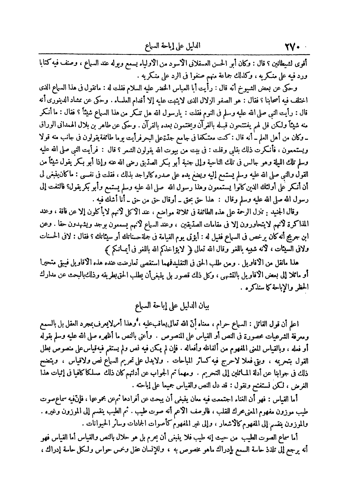 ولا يدل على تحريم السماع نص ولا قياس ويتضح ذلك في جوابنا عن أدلة المائلين إلى التحريم