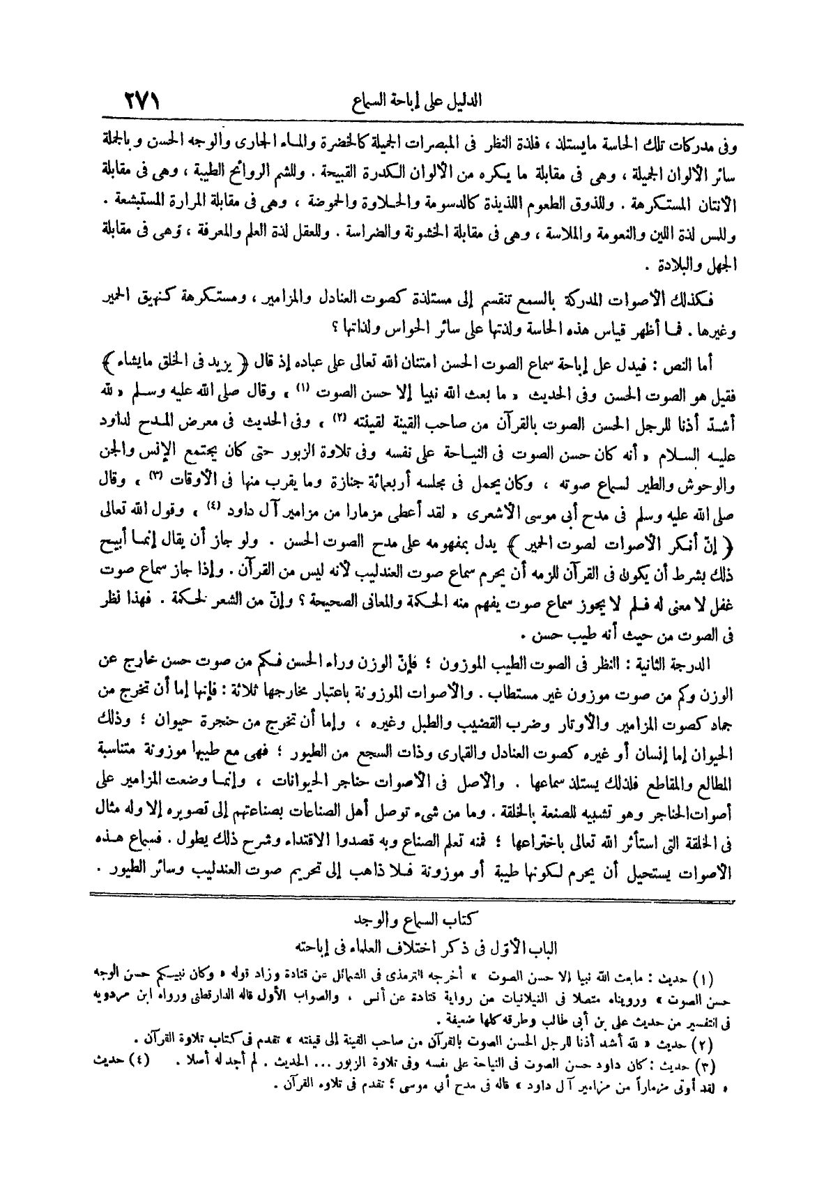 أما النص فيدل على إباحة سماع الصوت الحسن امتنان الله تعالى على عباده إذ قال {يزيد في الخلق ما يشاء} فقيل هو الصوت الحسن وفي الحديث ما بعث الله نبياً إلا حسن الصوت (¬1)