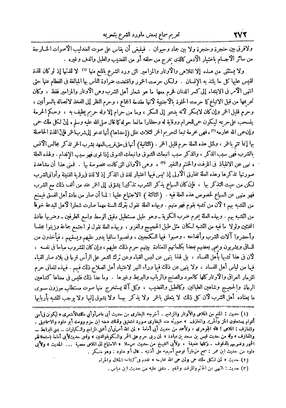 ولكن حرمت الخمور واقتضت ضراوة الناس بها المبالغة في الفطام عنها حتى انتهى الأمر في الابتداء إلى كسر الدنان فحرم معها ما هو شعار أهل الشرب وهي الأوتار والمزامير فقط وكان تحريمها من قبل الأتباع كما حرمت الخلوة بالأجنبية لأنها مقدمة الجماع وحرم النظر إلى الفخذ لاتصاله بالسوأتين وحرم قليل الخمر وإن كان لا يسكر لأنه يدعو إلى السكر وما من حرام إلا وله حريم يطيف به وحكم الحرمة ينسحب على حريمه ليكون حمى للحرام ووقاية له وحظارا مانعاً حوله كما قال صلى الله عليه وسلم إن لكل ملك حمى وإن حمى الله محارمه (¬2) فهي محرمة تبعاً لتحريم الخمر لثلاث علل
