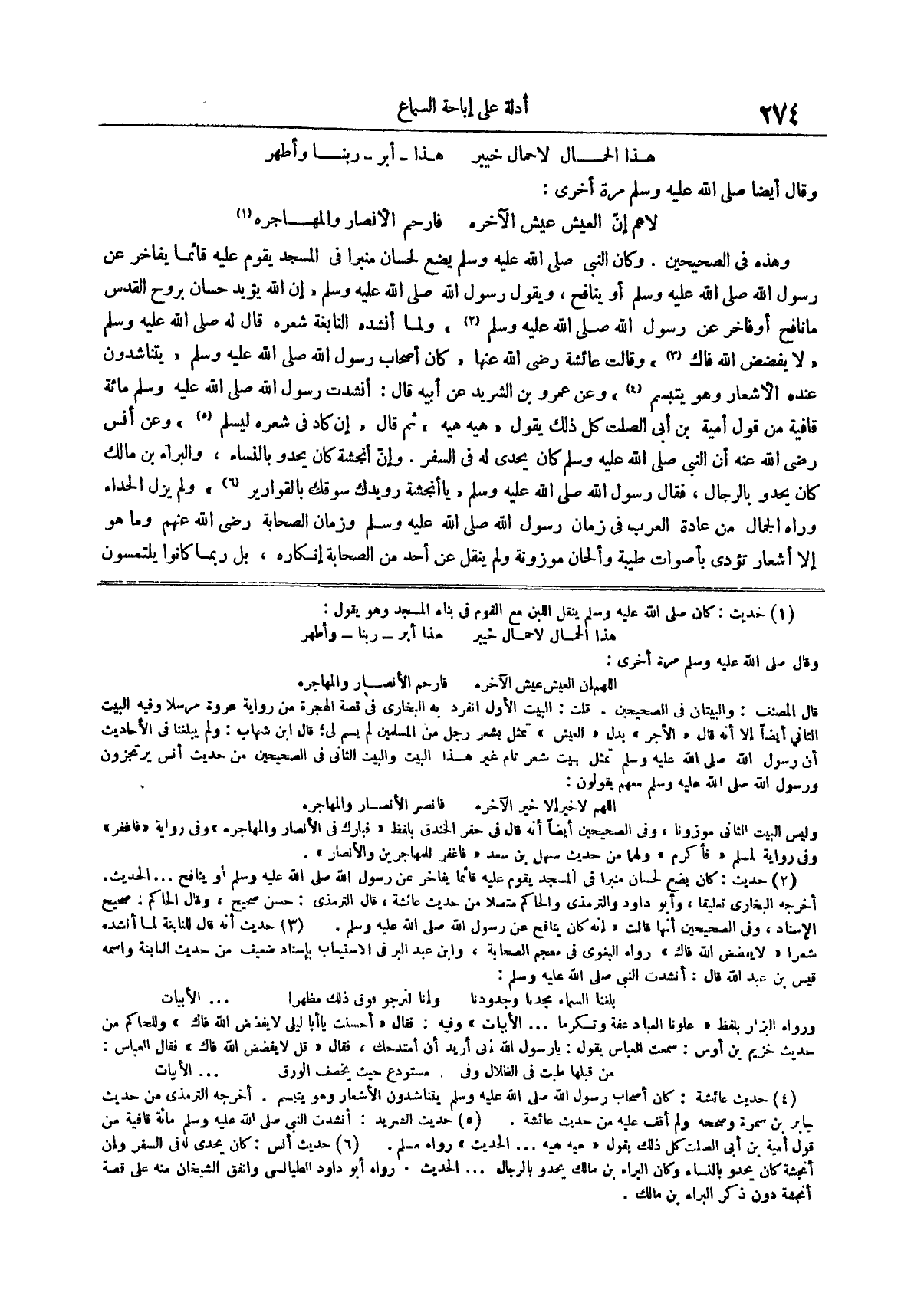 اللهم إن العيش عيش الآخرة ... فارحم الأنصار والمهاجرة قال المصنف والبيتان في الصحيحين قلت البيت الأول انفرد به البخاري في قصة الهجرة من رواية عروة مرسلا وفيه البيت الثاني أيضا إلا أنه قال الأجر بدل العيش تمثل بشعر رجل من المسلمين لم يسم لي قال ابن شهاب ولم يبلغنا في الأحاديث أن رسول الله صلى الله عليه وسلم تمثل ببيت شعر تام غير هذا البيت والبيت الثاني في الصحيحين من حديث أنس يرتجزون ورسول الله صلى الله عليه وسلم معهم يقولون