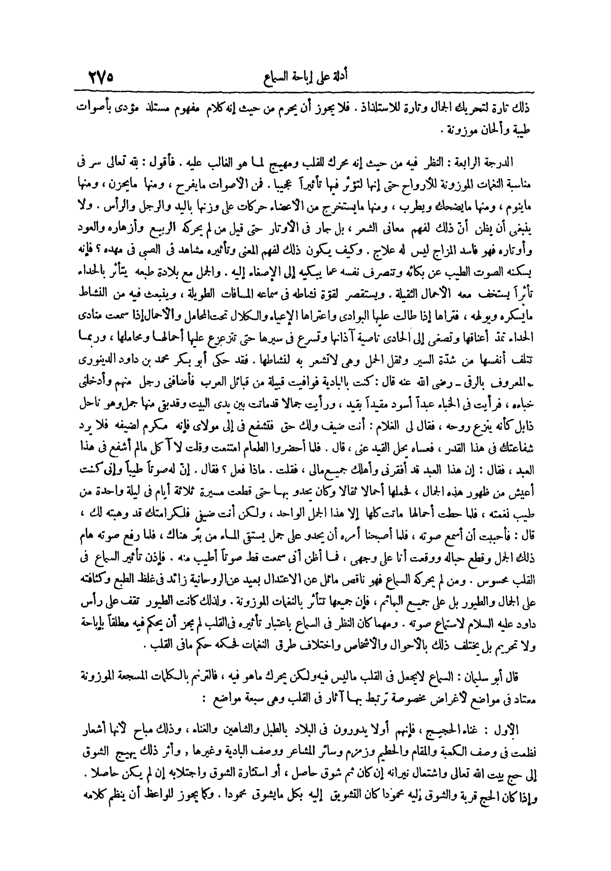 فأقول لله تعالى سر في مناسبة النغمات الموزونة للأرواح حتى إنها لتؤثر فيها تأثيراً عجيباً
