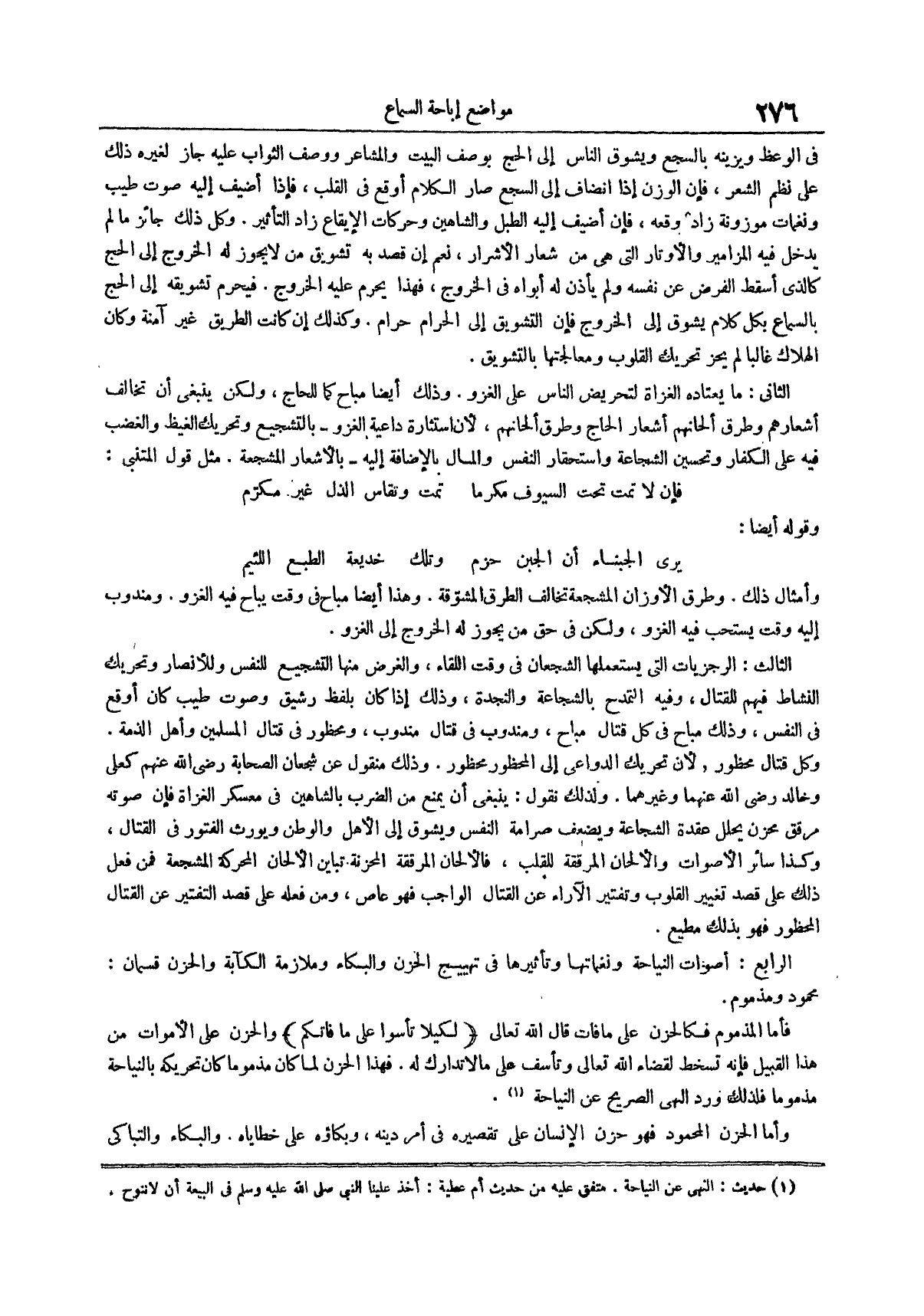الرابع أصوات النياحة ونغماتها وتأثيرها في تهييج الحزن والبكاء وملازمة الكآبة والحزن قسمان محمود ومذموم