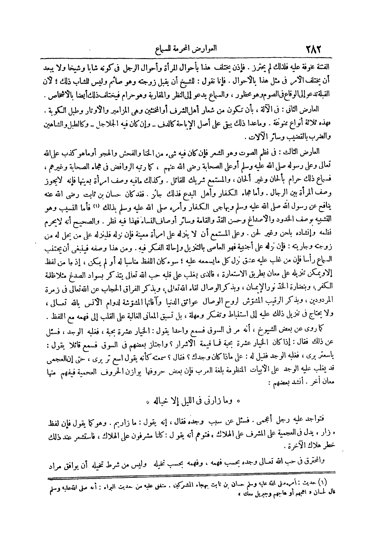العارض الثالث في نظم الصوت وهو الشعر فإن كان فيه شيء من الخنا والفحش والهجو أو ما هو كذب على الله تعالى وعلى رسوله صلى الله عليه وسلم أو على الصحابة رضي الله عنهم كما رتبه الروافض في هجاء الصحابة وغيرهم فسماع ذلك حرام بألحان وغير ألحان والمستمع شريك للقائل