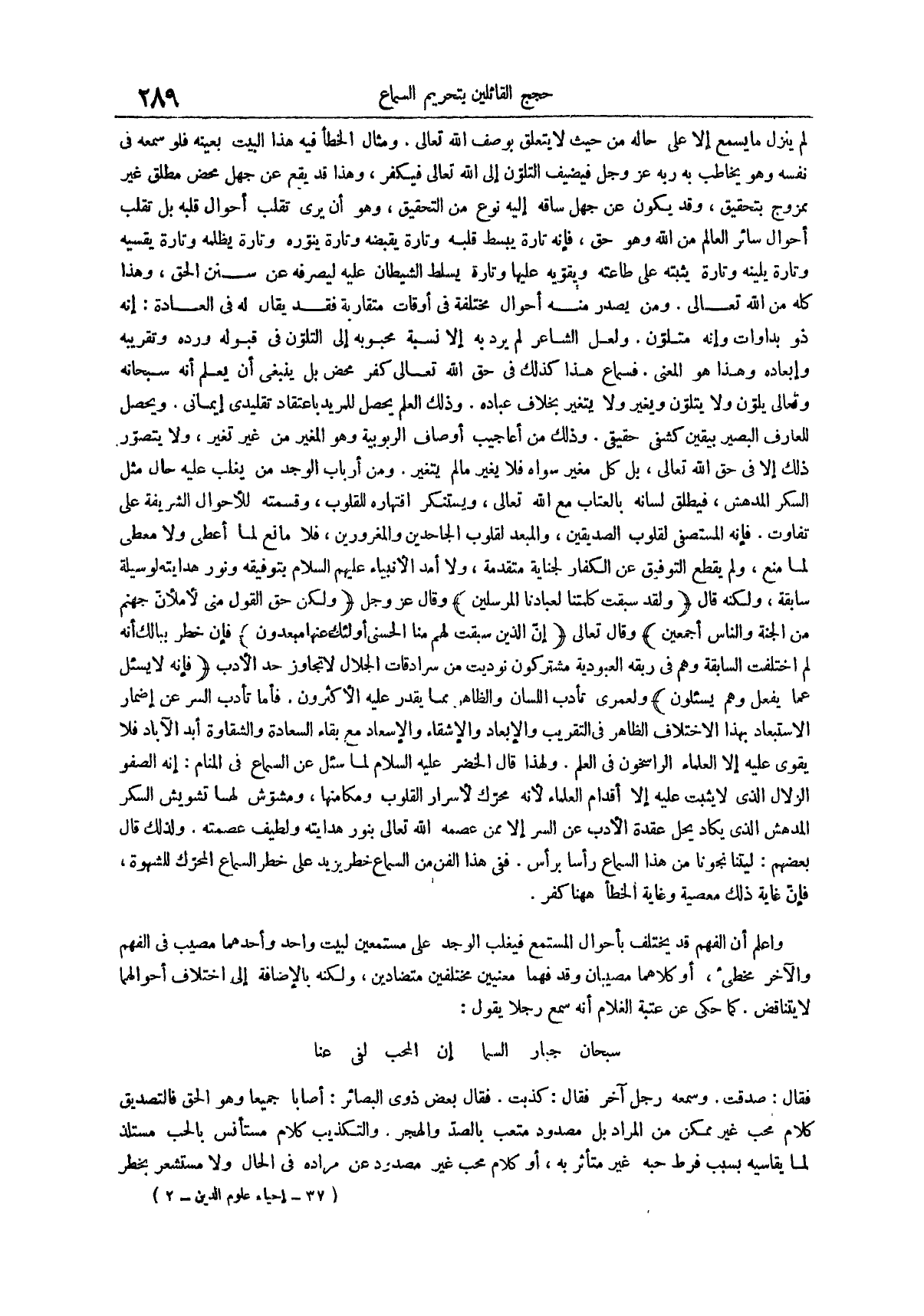 واعلم أن الفهم قد يختلف بأحوال المستمع فيغلب الوجد على مستمعين لبيت واحد وأحدهما مصيب في الفهم والآخر مخطىءأو كلاهما مصيبان وقد فهما معنيين مختلفين متضادين ولكنه بالإضافة إلى اختلاف أحوالهما لا يتناقض