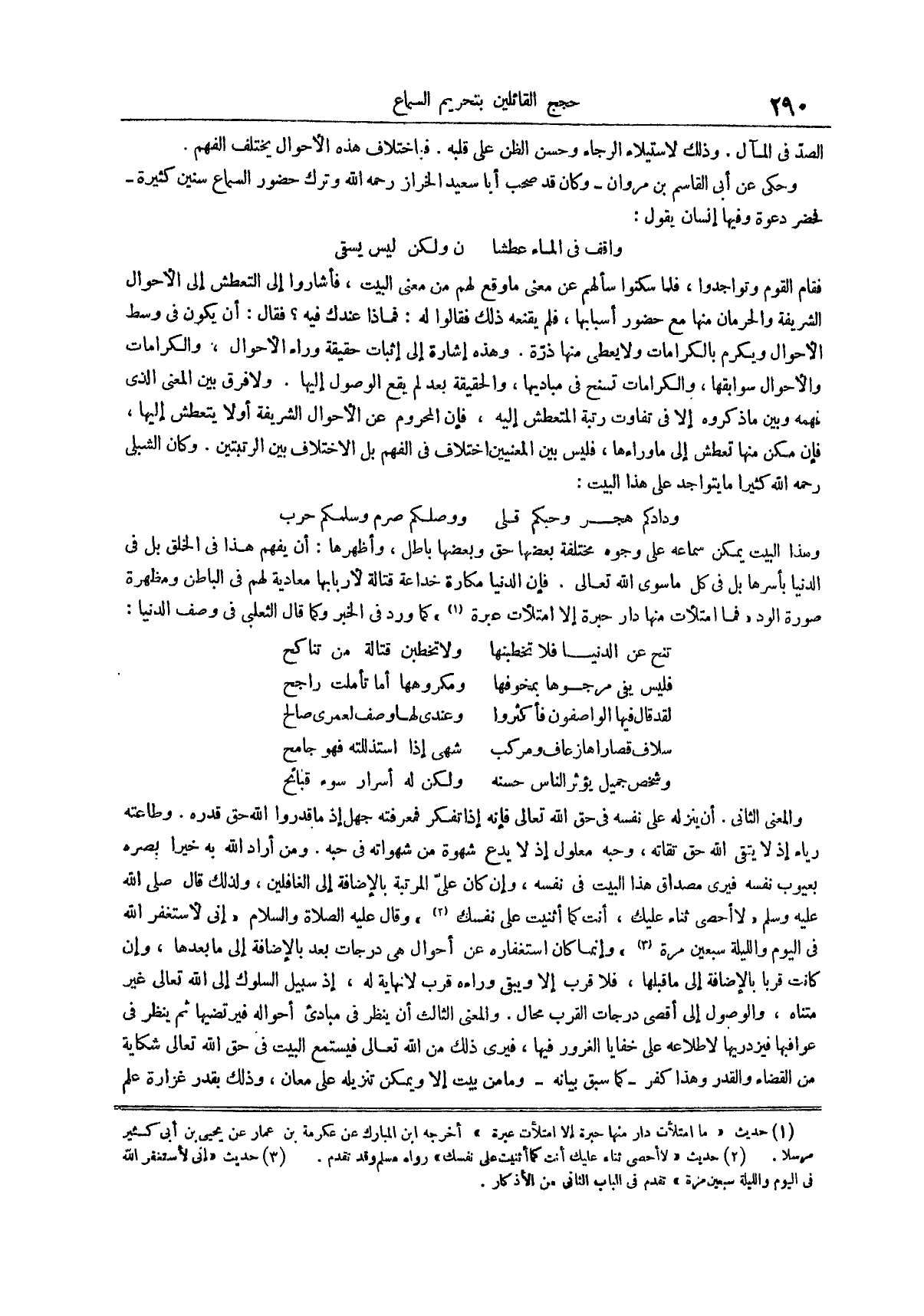 والمعنى الثالث أن ينظر في مبادئ أحواله فيرتضيها ثم ينظر في عوافيها فيزدريها لإطلاعه على خفايا الغرور فيها فيرى ذلك من الله تعالى فيستمع البيت في حق الله تعالى شكاية من القضاء والقدر وهذا كفر كما سبق بيانه وما من بيت إلا ويمكن تنزيله على معان وذلك بقدر غزارة علم