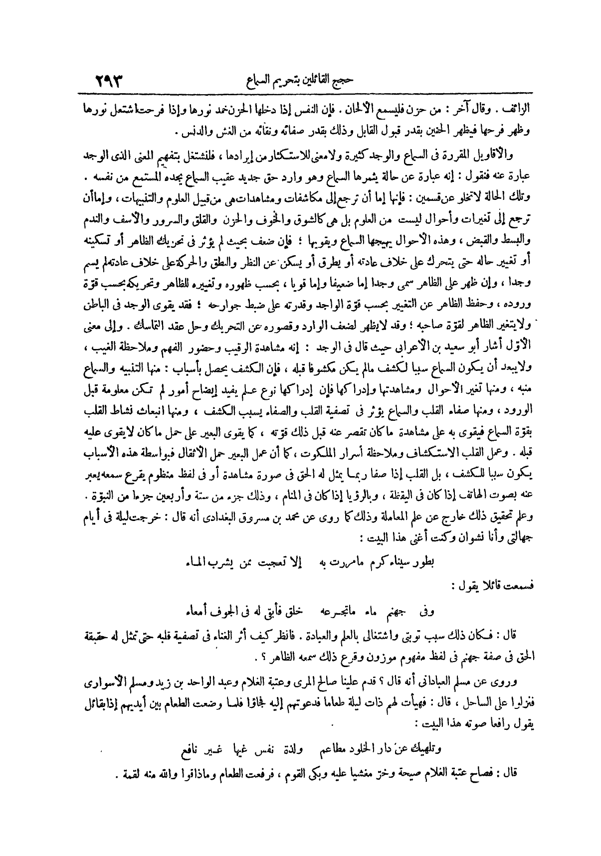 وإلى معنى الأول أشار أبو سعيد بن الأعرابي حيث قال في الوجد إنه مشاهدة الرقيب وحضور الفهم وملاحظة الغيب ولا يبعد أن يكون السماع سبباً لكشف ما لم يكن مكشوفاً قبله فإن الكشف يحصل بأسباب منها التنبيه والسماع منبه ومنها تغير الأحوال ومشاهدتها وإدراكها فإن إدراكها نوع علم يفيد إيضاح أمور لم تكن معلومة قبل الورود ومنها صفاء القلب والسماع يؤثر في تصفية القلب والصفاء يسبب الكشف ومنها انبعاث نشاط القلب بقوة السماع فيقوى به على مشاهدة ما كان تقصر عنه قبل ذلك قوته كما يقوى البعير على حمل ما كان لا يقوى عليه قبله