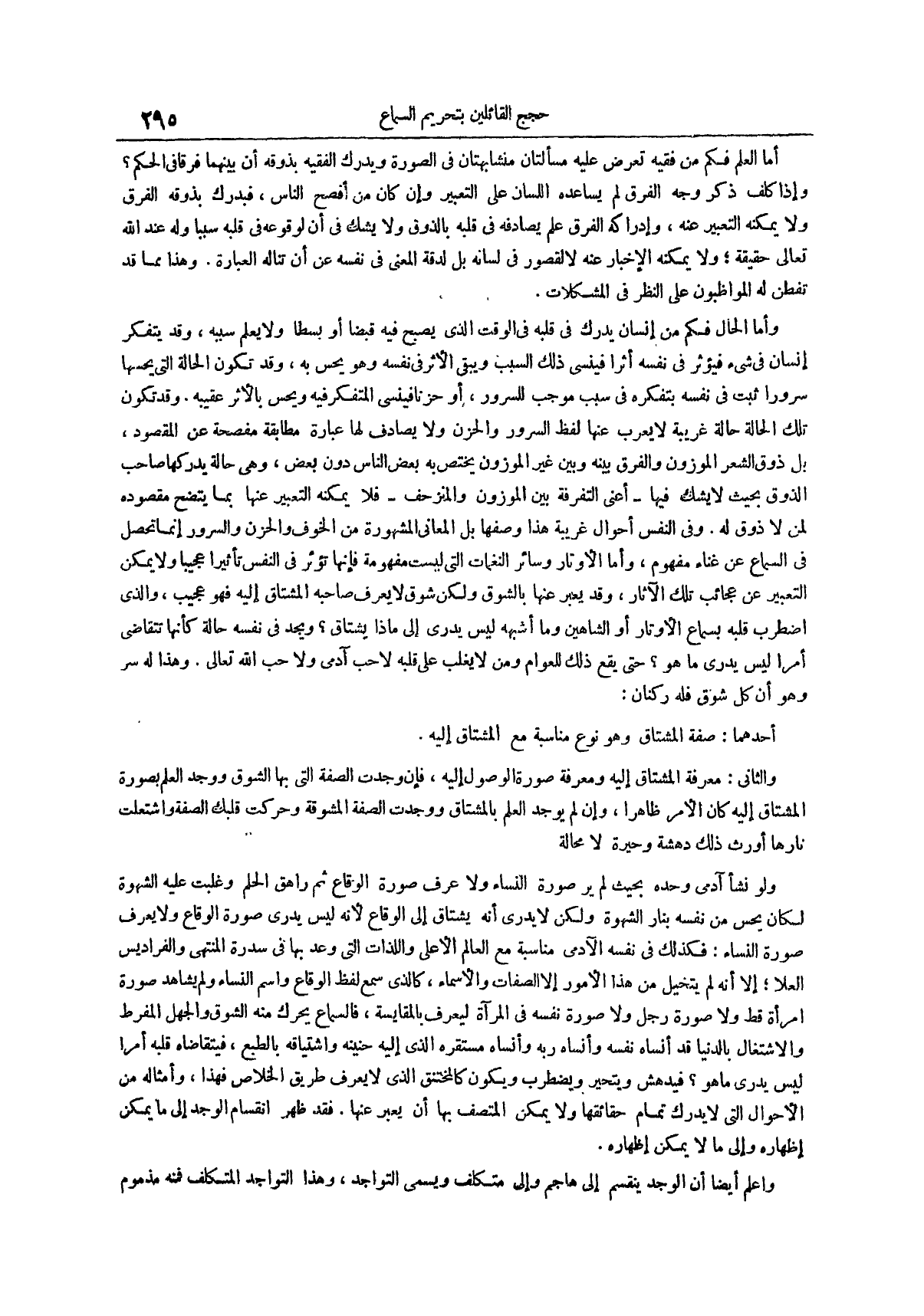 أما العلم فكم من فقيه تعرض عليه مسألتان متشابهتان في الصورة ويدرك الفقيه بذوقه أن بينهما فرقاً في الحكم وإذا كلف ذكر وجه الفرق لم يساعده اللسان على التعبير وإن كان من أفصح الناس فيدرك بذوقه الفرق ولا يمكنه التعبير عنه وإدراكه الفرق علم يصادفه في قلبه بالذوق ولا يشك في أن لوقوعه في قلبه سبباً وله عند الله تعالى حقيقة ولا يمكنه الإخبار عنه لا لقصور في لسانه بل لدقة المعنى في نفسه عن أن تناله العبارة