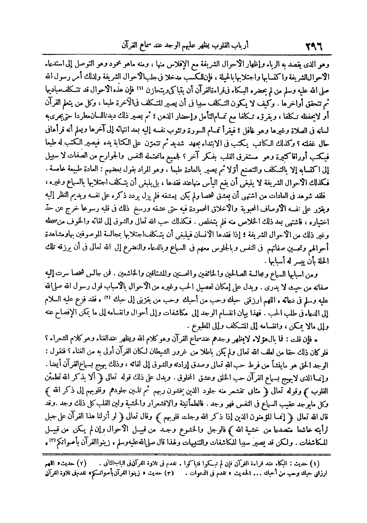 فإن قلت فما بال هؤلاء لا يظهر وجدهم عند سماع القرآن وهو كلام الله ويظهر عند الغناء وهو كلام الشعراء فلو كان ذلك حقاً من لطف الله تعالى ولم يكن باطلاً من غرور الشيطان لكان القرآن أولى به من الغناء فنقول الوجد الحق هو ما ينشأ من فرط حب الله تعالى وصدق إرادته والشوق إلى لقائه وذلك يهيج بسماع القرآن أيضاً