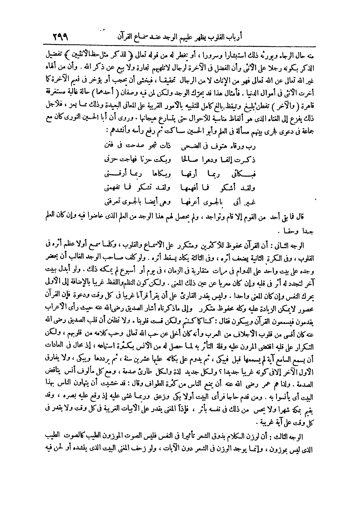 ومن قدم حاجاً فرأى البيت أولاً بكى وزعق وربما غشي عليه إذ وقع عليه بصره وقد يقيم بمكة شهراً ولا يحس من ذلك في نفسه بأثر فإذاً المغنى يقدر على الأبيات الغريبة في كل وقت ولا يقدر في كل وقت على آية غريبة
