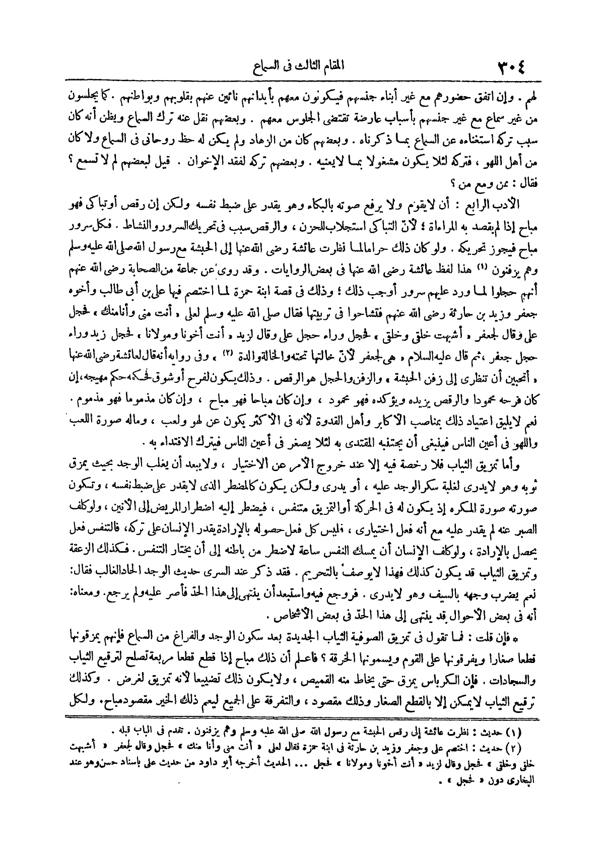الأدب الرابع أن لا يقوم ولا يرفع صوته بالبكاء وهو يقدر على ضبط نفسه ولكن إن رقص أو تباكى فهو مباح إذا لم يقصد به المراءاة لأن التباكي استجلاب للحزن والرقص سبب في تحريك السرور والنشاط