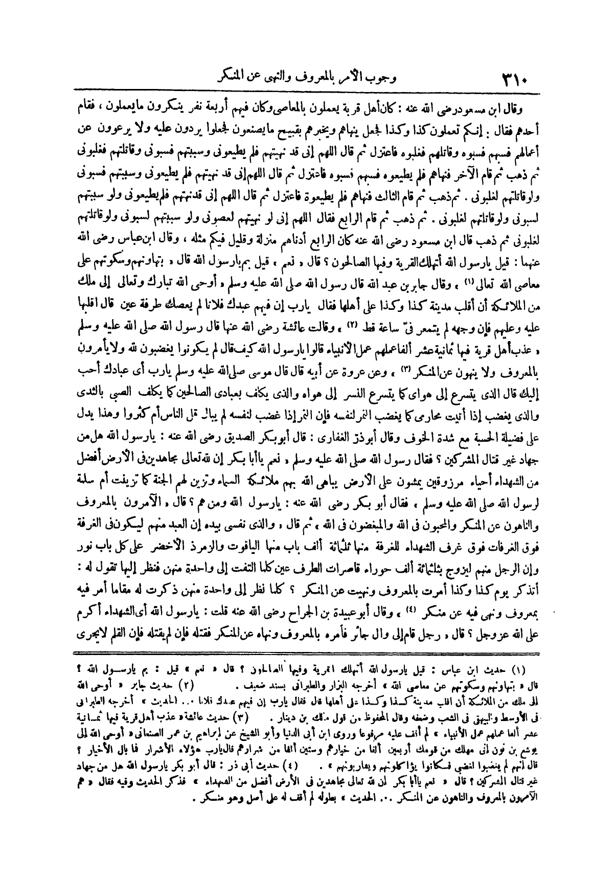 وقال ابن مسعود رضي الله عنه كان أهل قرية يعملون بالمعاصي وكان فيهم أربعة نفر ينكرون ما يعملون فقام أحدهم فقال إنكم تعملون كذا وكذا فجعل ينهاهم ويخبرهم بقبيح ما يصنعون فجعلوا يردون عليه ولا يرعوون عن أعمالهم فسبهم فسبوه وقاتلهم فغلبوه فاعتزل ثم قال اللهم إني قد نهيتهم فلم يطيعوني وسببتهم فسبوني وقاتلتهم فغلبوني ثم ذهب ثم قام الآخر فنهاههم فلم يطيعوه فسبهم فسبوه فاعتزل ثم قال اللهم إني قد نهيتهم فلم يطيعوني وسببتهم فسبوني ولو قاتلتهم لغلبوني ثم ذهب قام الثالث فنهاهم فلم يطيعوه فاعتزل ثم قال اللهم إني قد نهيتهم فلم يطيعوني ولو سببتهم لسبوني ولو قاتلتهم لغلبوني