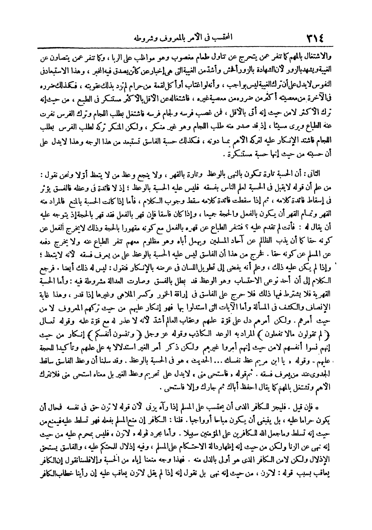 الثاني أن الحسبة تارة تكون بالنهي بالوعظ وتارة بالقهر ولا ينجع وعظ من لا يتعظ أولاً ونحن نقول من علم أن قوله لا يقبل في الحسبة لعلم الناس بفسقه فليس عليه الحسبة بالوعظ إذ لا فائدة في وعظه فالفسق يؤثر في إسقاط فائدة كلامه ثم إذا سقطت فائدة كلامه سقط وجوب الكلام فأما إذا كانت الحسبة بالمنع فالمراد منه القهر وتمام القهر أن يكون بالفعل والحجة جميعاً وإذا كان فاسقاً فإن قهر بالفعل فقد قهر بالحجة إذ يتوجه عليه أن يقال له فأنت لم تقدم عليه فتنفر الطباع عن قهره بالفعل مع كونه مقهوراً بالحجة وذلك لا يخرج الفعل عن كونه حقا كما أن يذب الظالم عن آحاد المسلمين ويهمل أباه وهو مظلوم معهم تنفر الطباع عنه ولا يخرج دفعه عن المسلم عن كونه حقاً