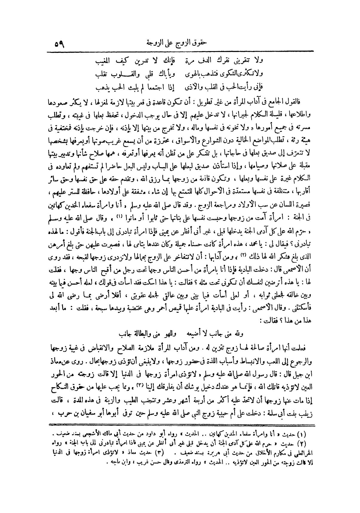 فَالْقَوْلُ الْجَامِعُ فِي آدَابِ الْمَرْأَةِ مِنْ غَيْرِ تَطْوِيلٍ أَنْ تَكُونَ قَاعِدَةً فِي قَعْرِ بَيْتِهَا لَازِمَةً لِمِغْزَلِهَا لَا يَكْثُرَ صُعُودُهَا وَاطِّلَاعُهَا قَلِيلَةَ الْكَلَامِ لِجِيرَانِهَا لَا تَدْخُلَ عَلَيْهِمْ إِلَّا فِي حَالٍ يُوجِبُ الدُّخُولَ تَحْفَظَ بَعْلَهَا فِي غَيْبَتِهِ وَتَطْلُبَ مَسَرَّتَهُ فِي جَمِيعِ أُمُورِهَا وَلَا تَخُونَهُ فِي نَفْسِهَا وَمَالِهِ وَلَا تَخْرُجَ مِنْ بَيْتِهَا إِلَّا بِإِذْنِهِ فَإِنْ خَرَجَتْ بِإِذْنِهِ فَمُخْتَفِيَةً فِي هيئة رئة تَطْلُبُ الْمَوَاضِعَ الْخَالِيَةَ دُونَ الشَّوَارِعِ وَالْأَسْوَاقِ مُحْتَرِزَةً مِنْ أَنْ يَسْمَعَ غَرِيبٌ صَوْتَهَا أَوْ يَعْرِفَهَا بِشَخْصِهَا لَا تَتَعَرَّفَ إِلَى صَدِيقِ بَعْلِهَا فِي حَاجَاتِهَا بَلْ تَتَنَكَّرَ عَلَى مَنْ تَظُنُّ أَنَّهُ يَعْرِفُهَا أَوْ تَعْرِفُهُ هَمُّهَا صَلَاحُ شَأْنِهَا وَتَدْبِيرُ بَيْتِهَا مُقْبِلَةٌ عَلَى صَلَاتِهَا وَصِيَامِهَا وَإِذَا اسْتَأْذَنَ صَدِيقٌ لِبَعْلِهَا عَلَى الْبَابِ وَلَيْسَ الْبَعْلُ حَاضِرًا لَمْ تَسْتَفْهِمْ وَلَمْ تُعَاوِدْهُ فِي الْكَلَامِ غَيْرَةً عَلَى نَفْسِهَا وَبَعْلِهَا وَتَكُونَ قَانِعَةً مِنْ زَوْجِهَا بِمَا رَزَقَ اللَّهُ وَتُقَدِّمَ حَقَّهُ عَلَى حَقِّ نفسها وحق سائر أقاربها منتظفة فِي نَفْسِهَا مُسْتَعِدَّةً فِي الْأَحْوَالِ كُلِّهَا لِلتَّمَتُّعِ بها إِنْ شَاءَ مُشْفِقَةً عَلَى أَوْلَادِهَا حَافِظَةً لِلسِّتْرِ عَلَيْهِمْ قَصِيرَةَ اللِّسَانِ عَنْ سَبِّ الْأَوْلَادِ وَمُرَاجَعَةِ الزوج