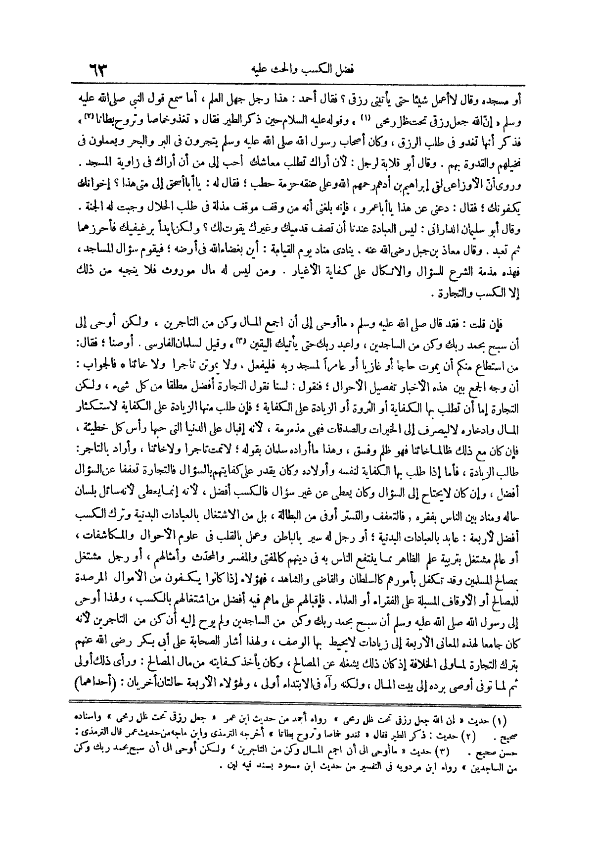 وقيل لسلمان الفارسي أوصنا فقال من استطاع منكم أن يموت حاجاً أو غازياً أو عامراً لمسجد ربه فليفعل ولا يموتن تاجرا ولا خائناً فالجواب أن وجه الجمع بين هذه الأخبار تفصيل الأحوال فنقول لسنا نقول التجارة أفضل مطلقاً من كل شيء ولكن التجارة إما أن تطلب بها الكفاية أو الثروة أو الزيادة على الكفاية فإن طلب منها الزيادة على الكفاية لاستكثار المال وادخاره لا ليصرف إلى الخيرات والصدقات فهي مذمومة لأنه إقبال على الدنيا التي حبها رأس كل خطيئة فإن كان مع ذلك ظالماً خائناً فهو ظلم وفسق وهذا ما أراده سلمان بقوله لا تمت تاجراً ولا خائناً وأراد بالتاجر طالب الزيادة فأما إذا طلب بها الكفاية لنفسه وأولاده وكان يقدر على كفايتهم بالسؤال فالتجارة تعففاً عن السؤال أفضل وإن كان لا يحتاج إلى السؤال وكان يعطى عن غير سؤال فالكسب أفضل لأنه إنما يعطى لأنه سائل بلسان حاله ومناد بين الناس بفقره فالتعفف والتستر أوفى من البطالة بل من الاشتغال بالعبادات البدنية وترك الكسب أفضل لأربعة عابد بالعبادات البدنية أو رجل له سير بالباطن وعمل بالقلب في علوم الأحوال والمكاشفات أو عالم مُشْتَغِلٍ بِتَرْبِيَةِ عِلْمِ الظَّاهِرِ مِمَّا يَنْتَفِعُ النَّاسُ به في دينهم كالمفتي وَالْمُفَسِّرِ وَالْمُحَدِّثِ وَأَمْثَالِهِمْ أَوْ رَجُلٍ مُشْتَغِلٍ بِمَصَالِحِ المسلمين وقد تكفل بأمورهم كالسلطان والقاضي والشاهد فهؤلاء إذا كانوا يُكْفَوْنَ مِنَ الْأَمْوَالِ الْمُرْصَدَةِ لِلْمَصَالِحِ أَوِ الْأَوْقَافِ الْمُسْبَلَةِ عَلَى الْفُقَرَاءِ أَوِ الْعُلَمَاءِ