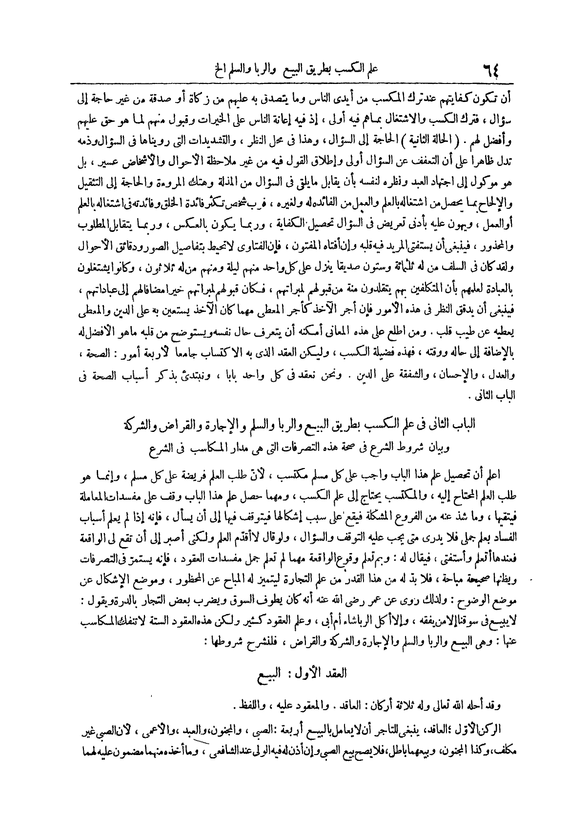 الباب الثاني في علم الكسب بطريق البيع والربا والسلم والإجارة والقراض