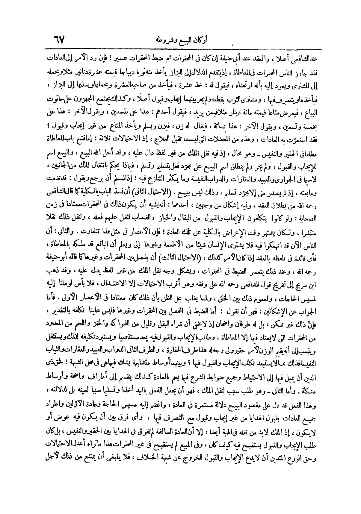 فأما الجواب عن الإشكالين فهو أن نقول أما الضبط في الفصل بين المحقرات وغيرها فليس علينا تكلفة بالتقدير فإن ذلك غير ممكن بل له طرفان واضحان إذ لا يخفى أن شراء البقل وقليل من الفواكه والخبز واللحم من المعدود من الحقرات التي لا يعتاد فيها إلا المعاطاة وطالب الإيجاب والقبول فيه يعد مستقصياً ويستبرد تكليفه لذلك ويستثقل وينسب إلى أنه يقيم الوزن لأمر حقير ولى وجه له هذا طرف الحقارة والطرف الثاني الدواب والعبيد والعقارات والثياب النفيسة فذلك مما لا يستبعد تكلف الإيجاب والقبول فيها وبينهما أوساط متشابهة يشك فيها هي في محل الشبهة فحق ذي الدين أن يميل فيها إلى الاحتياط وجميع ضوابط الشرع فيما يعلم بالعادة كذلك ينقسم إلى أطراف واضحة وأوساط مشكلة
