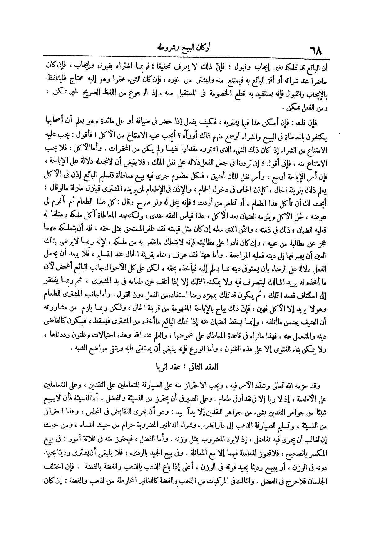 وأما جانب المشتري للطعام وهو لا يريد إلا الأكل فهين فإن ذلك يباح بالإباحة المفهومة من قرينة الحال ولكن ربما يلزم من مشاورته أن الضيف يضمن ما أتلفه وإنما يسقط الضمان عنه إذا تملك البائع ما أخذه من المشتري فيسقط فيكون كالقاضي دينه والمتحمل عنه فهذا ما نراه في قاعدة المعاطاة على غموضها والعلم عند الله وهذه احتمالات وظنون رددناها ولا يمكن بناء الفتوى إلا على هذه الظنون وأما الورع فإنه ينبغي أن يستفتى قلبه ويتقي مواضع الشبه العقد الثاني عقد الربا