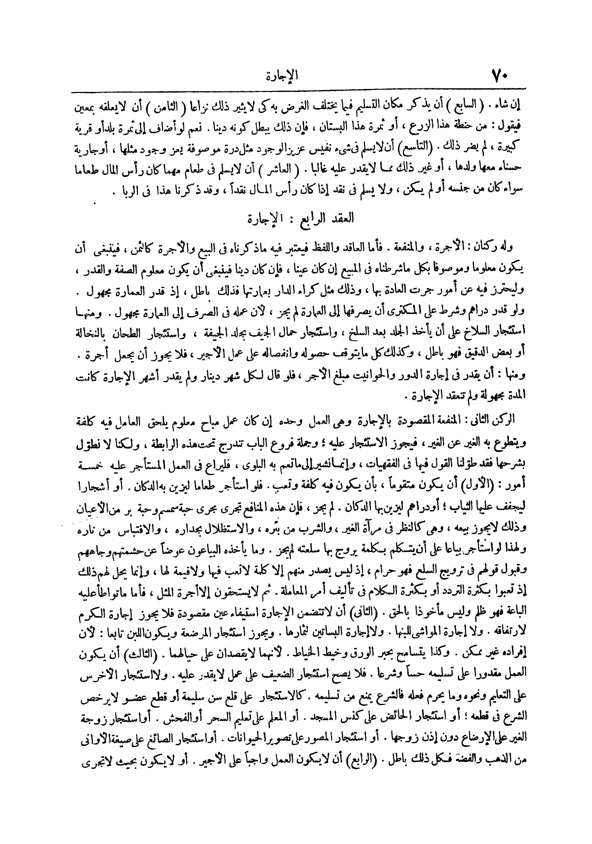 العاشر أن لا يسلم في طعام مهما كان رأس المال طعاماً سواء كان من جنسه أو لم يكن ولا يسلم في نقد إذا كان رأس المال نقداً وقد ذكرنا هذا في الربا العقد الرابع الإجارة