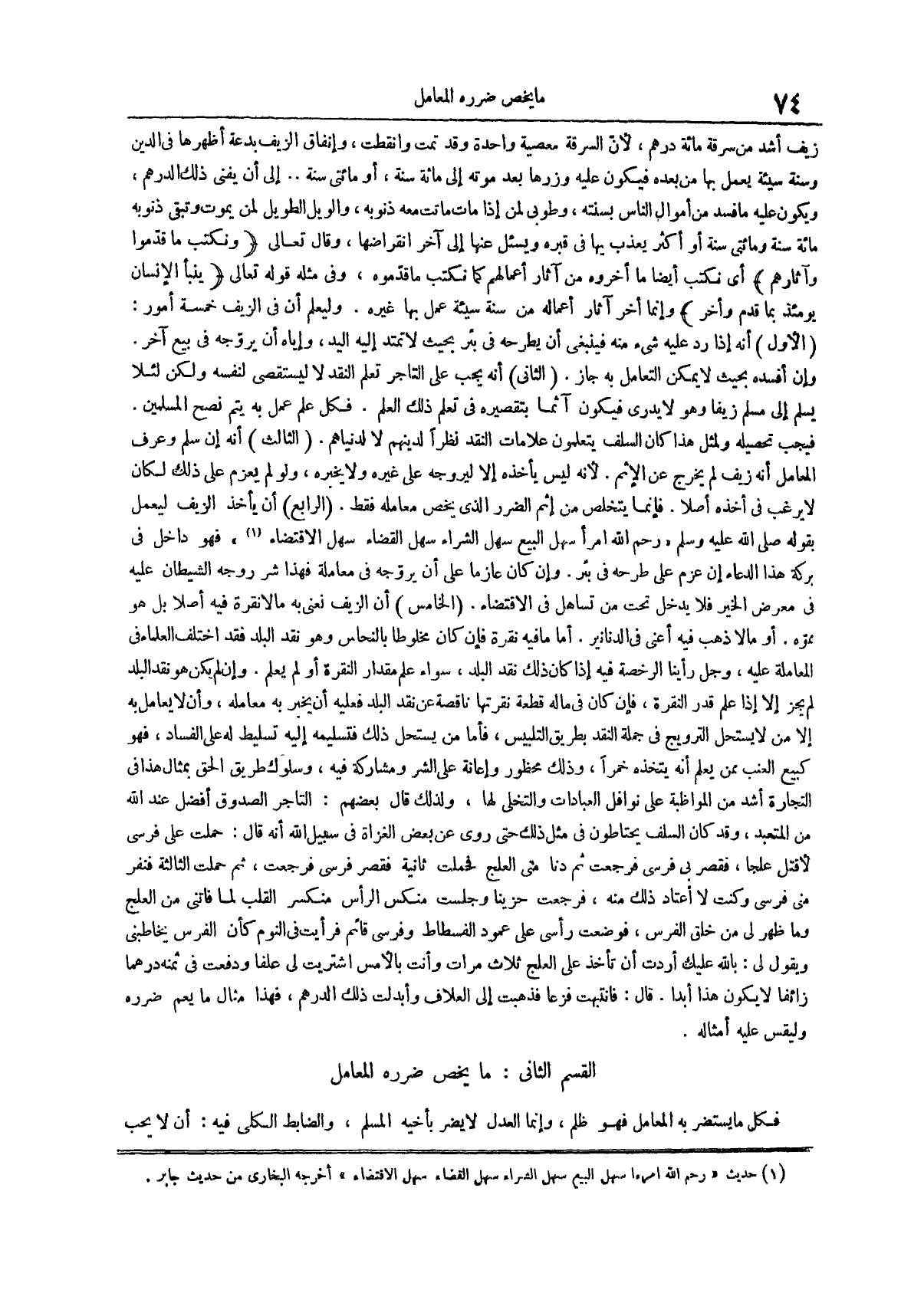 قال فانتبهت فزعاً فذهبت إلى العلاف وأبدلت ذلك الدرهم فهذا مثال ما يعم ضرره وليقس عليه أمثاله الْقِسْمُ الثَّانِي مَا يَخُصُّ ضَرَرُهُ الْمُعَامِلَ