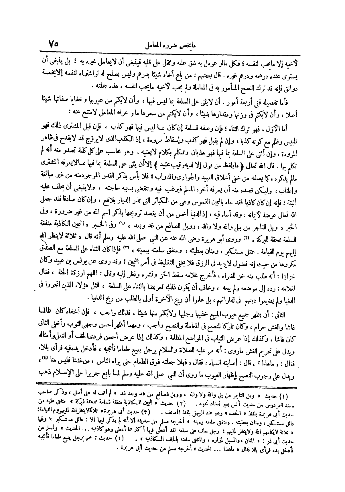 أَنْ لَا يُثْنِيَ عَلَى السِّلْعَةِ بِمَا لَيْسَ فيها وأن لا يكتم من عيوبها وخفايا صفاتها شيئاً أصلاً وأن لا يكتم في وزنها ومقدارها شيئاً وأن لا يكتم من سعرها ما لو عرفه المعامل لامتنع عنه