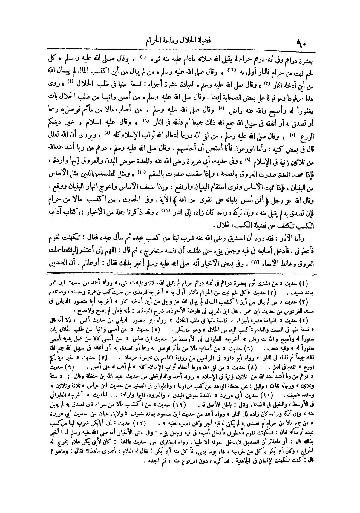 (¬1) حديث من اشترى ثوباً بعشرة دراهم في ثمنه درهم حرام لم يقبل الله صلاته وعليه منه شيء رواه أحمد من حديث ابن عمر بسند ضعيف