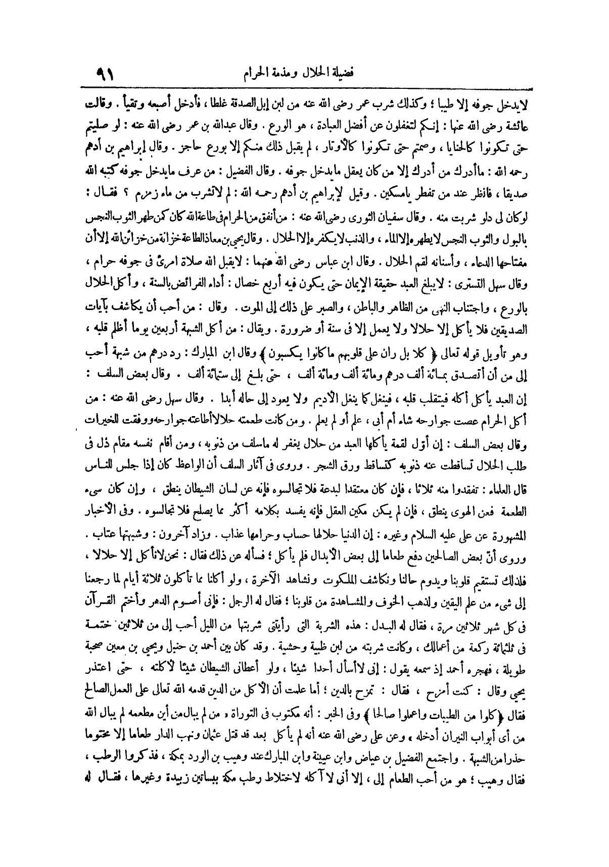 وقال الفضيل من عرف ما يدخل جوفه كتبه الله صديقاً فانظر عند من تفطر يا مسكين وقيل لإبراهيم بن أدهم رحمه الله لم لا تشرب من ماء زمزم فقال لو كان لي دلو شربت منه