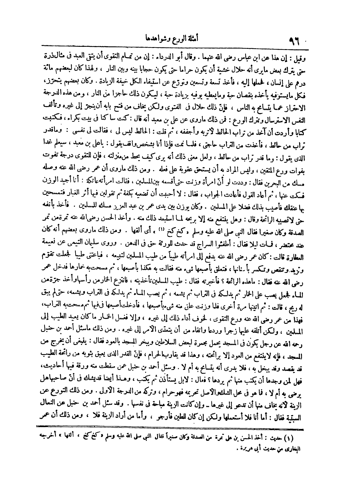 وكان بعضهم يتحرز فكل ما يستوفيه يأخذه ينقصان حبة وما يعطيه يوفيه بزيادة حبة ليكون ذلك حاجزاً من النار ومن هذه الدرجة الِاحْتِرَازُ عَمَّا يَتَسَامَحُ بِهِ النَّاسُ فَإِنَّ ذَلِكَ حَلَالٌ فِي الْفَتْوَى وَلَكِنْ يُخَافُ مِنْ فَتْحِ بَابِهِ أَنْ يَنْجَرَّ إِلَى غَيْرِهِ وَتَأْلَفَ النَّفْسُ الاسترسال وتترك الورع فمن ذلك ما روي عن علي بن معبد أنه قال كنت ساكناً في بيت بكراء فكتبت كتاباً وأردت أن آخذ من تراب الحائط لأتربه وأجففه ثم قلت الحائط ليس لي فقالت لي نفسي وما قدر تراب من حائط فأخذت من التراب حاجتي فلما نمت فإذا أنا بشخص واقف يقول يا علي بن معبد سيعلم غداً الذي يقول وما قدر تراب من حائط ولعل معنى ذلك انه يرى كيف يحط من منزلته فإن للتقوى درجة تفوت بفوات ورع المتقين وليس المراد به أن يستحق عقوبة على فعله
