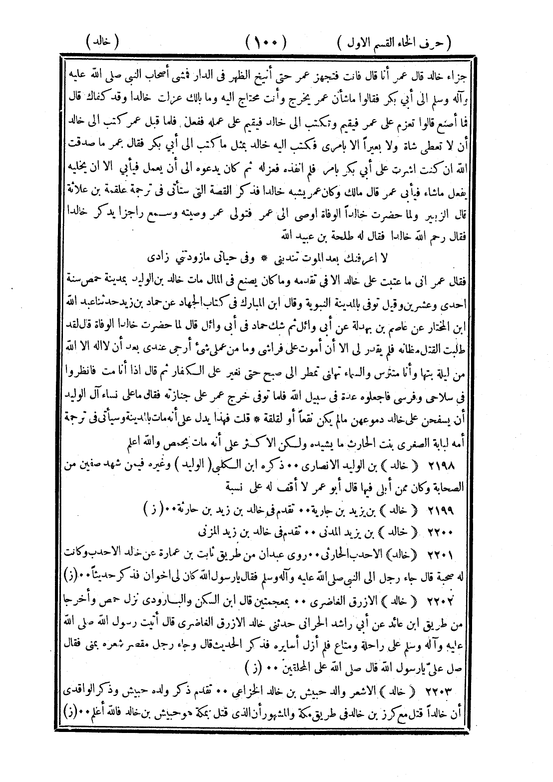 <100> جزاء خالد قال عمر أنا قال فأنت فتجهز عمر حتى أنيخ الظهر في الدار فمشى أصحاب النبي صلى الله عليه وسلم إلى أبي بكر فقالوا ما شأن عمر يخرج وأنت محتاج إليه وما لك عزلت خالدا وقد كفاك قال فما أصنع قالوا تعزم على عمر فيقيم وتكتب إلى خالد فيقيم على عمله ففعل فلما قبل عمر كتب إلى خالد ألا تعطي شاة ولا بعيرا إلا بأمري فكتب إليه خالد بمثل ما كتب إلى أبي بكر فقال عمر ما صدقت الله إن كنت أشرت على أبي بكر بأمر فلم أنفذه فعزله ثم كان يدعوه إلى أن يعمل فيأبى إلا أن يخليه يفعل ما شاء فيأبى عمر قال مالك وكان عمر يشبه خالدا فذكر القصة التي ستأتي في ترجمة علقمة بن علاثة قال الزبير ولما حضرت خالدا الوفاة أوصى إلى عمر فتولى عمر وصيته وسمع راجزا يذكر خالدا فقال رحم الله خالدا فقال له طليحة بن عبيد الله لا أعرفنك بعد الموت تندبني وفي حياتي ما زودتني زادي فقال عمر إني ما عتبت على خالد إلا في تقدمه وما كان يصنع في المال مات خالد بن الوليد بمدينة حمص سنة إحدى وعشرين وقيل توفي بالمدينة النبوية وقال بن المبارك في كتاب الجهاد عن حماد بن زيد حدثنا عبد الله بن المختار عن عاصم بن بهدلة عن أبي وائل ثم شك حماد في أبي وائل قال لما حضرت خالدا الوفاة قال لقد طلبت القتل مظانه فلم يقدر لي إلا أن أموت على فراشي وما من عملي شيء أرجى عندي بعد أن لا إله إلا الله من ليلة بتها وأنا متترس والسماء تهلني تمطر إلى صبح حتى نغير على الكفار ثم قال إذا أنا مت فانظروا في سلاحي وفرسي فاجعلوه عدة في سبيل الله فلما توفي خرج عمر إلى جنازته فقال ما على نساء آل الوليد أن يسفحن على خالد دموعهن ما لم يكن نقعا أو لقلقة قلت فهذا يدل على أنه مات بالمدينة وسيأتي في ترجمة أمه لبابة الصغرى بنت الحارث ما يشيده ولكن الأكثر على أنه مات بحمص والله أعلم خالد بن الوليد الأنصاري ذكره بن الكلبي وغيره فيمن شهد صفين من الصحابة وكان ممن أبلى فيها قال أبو عمر لا أقف له على نسبة خالد بن يزيد بن حارثة تقدم في خالد بن زيد بن حارثة خالد بن يزيد المدني تقدم في خالد بن زيد المزني خالد الأحدب الحارثي روى عبدان من طريق ثابت عن عمارة عن خالد الأحدب وكانت له صحبة قال جاء رجل إلى النبي صلى الله عليه وسلم فقال يا رسول الله كان لي أخوان فذكر حديثا خالد الأزرق الغاضري بمعجمتين قال بن السكن والباوردي نزل حمص وأخرجا من طريق بن عائذ عن أبي راشد الحبراني حدثني خالد الأزرق الغاضري قال أتيت رسول الله صلى الله عليه وسلم على راحلة ومتاع فلم أزل أسايره فذكر الحديث قال وجاء رجل مقصر شعره بمنى فقال صل على يا رسول الله قال صلى الله على المحلقين خالد الأشعر والد حبيش بن خالد الخزاعي تقدم ذكر ولده حبيش وذكر الواقدي أن خالدا قتل مع كرز بن خالد في طريق مكة والمشهور أن الذي قتل بمكة هو حبيش بن خالد فالله أعلم §