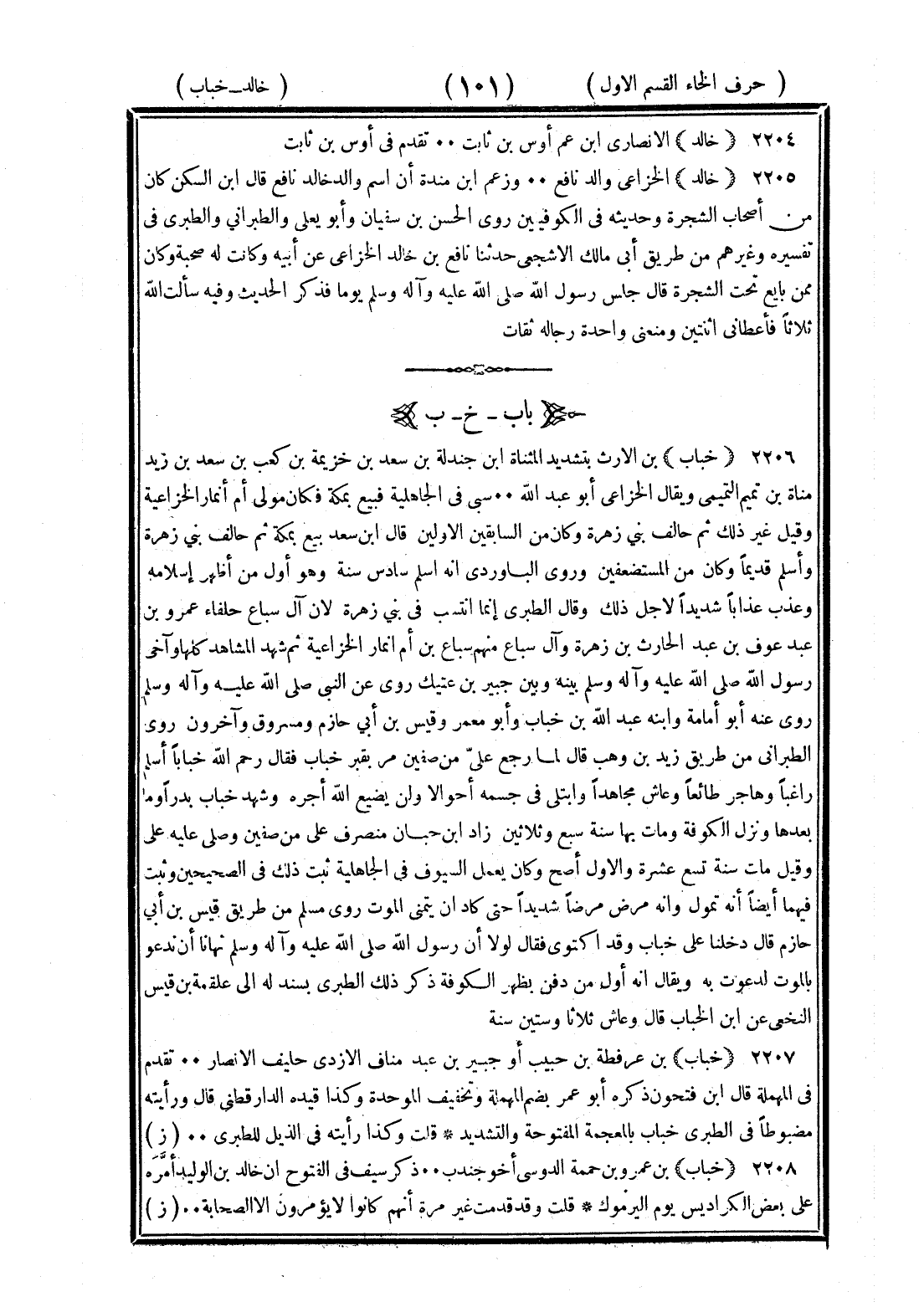 <101> خالد الأنصاري بن عم أوس بن ثابت تقدم في أوس بن ثابت خالد الخزاعي والد نافع وزعم بن منده أن اسم والد خالد نافع قال بن السكن كان من أصحاب الشجرة وحديثه في الكوفيين روى الحسن بن سفيان وأبو يعلى والطبراني والطبري في تفسيره وغيرهم من طريق أبي مالك الأشجعي حدثنا نافع بن خالد الخزاعي عن أبيه وكانت له صحبة وكان ممن بايع تحت الشجرة قال جلس رسول الله صلى الله عليه وسلم يوما فذكر الحديث وفيه سألت الله ثلاثا فأعطاني اثنتين ومنعني واحدة رجاله ثقات الخاء بعدها الباء خباب بن الأرت بتشديد المثناة بن جندلة بن سعد بن خزيمة بن كعب بن سعد بن زيد مناة بن تميم التميمي ويقال الخزاعي أبو عبد الله سبي في الجاهلية فنبيع بمكة فكان مولى أم أنمار الخزاعية وقيل غير ذلك ثم حالف بني زهرة وكان من السابقين الأولين وقال بن سعد بيع بمكة ثم حالف بني زهرة وأسلم قديما وكان من المستضعفين روى الباوردي أنه أسلم سادس ستة وهو أول من أظهر إسلامه وعذب عذابا شديدا لأجل ذلك وقال الطبري إنما انتسب في بني زهرة لأن آل سباع حلفاء عمرو بن عبد عوف بن الحارث بن زهرة وآل سباع منهم سباع بن أم أنمار الخزاعية ثم شهد المشاهد كلها وآخى رسول الله صلى الله عليه وسلم بينه وبين جبر بن عتيك روى عن النبي صلى الله عليه وسلم روى عنه أبو أمامه وابنه عبد الله بن خباب وأبو وأبو معمر وقيس بن أبي حازم ومسروق وآخرون وروى الطبراني من طريق زيد بن وهب قال لما رجع على من صفين مر بقبر خباب فقال رحم الله خبابا أسلم راغبا وهاجر طائعا وعاش مجاهدا وابتلى في جسمه أحوالا ولن يضيع الله أجره وشهد خباب بدرا وما بعدها ونزل الكوفة ومات بها سنة سبع وثلاثين زاد بن حبان منصرف على من صفين وصلى عليه علي وقيل مات سنة تسع عشرة والأول أصح وكان يعمل السيوف في الجاهلية ثبت ذلك في الصحيحين وثبت فيهما أيضا أنه تمول وأنه مرض شديدا حتى كاد أن يتمنى الموت روى مسلم من طريق قيس بن أبي حازم قال دخلنا على خباب وقد اكتوى فقال لولا أن رسول الله صلى الله عليه وسلم نهانا أن ندعو بالموت لدعوت به ويقال إنه أول من دفن بظهر الكوفة ذكر ذلك الطبري بسند له إلى علقمة بن قيس النخعي عن بن الخباب قال وعاش ثلاثا وستين سنة خباب أبو عرفطة بن خبيب أو جبير بن عبد مناف الأسدي حليف الأنصار تقدم في المهملة قال بن فتحون ذكره أبو عمر بضم المهملة وتخفيف الموحدة وكذا قيده الدارقطني قال ورأيته مضبوطا في الطبري خباب بالمعجمة المفتوحة والتشديد قلت وكذا رأيته في الذيل للطبري خباب بن عمرو بن حممة الدوسي أخو جندب ذكر سيف في الفتوح أن خالد بن الوليد أمره على بعض الكراديس يوم اليرموك قلت وقد قدمت غير مرة أنهم كانوا لا يؤمرون إلا الصحابة §