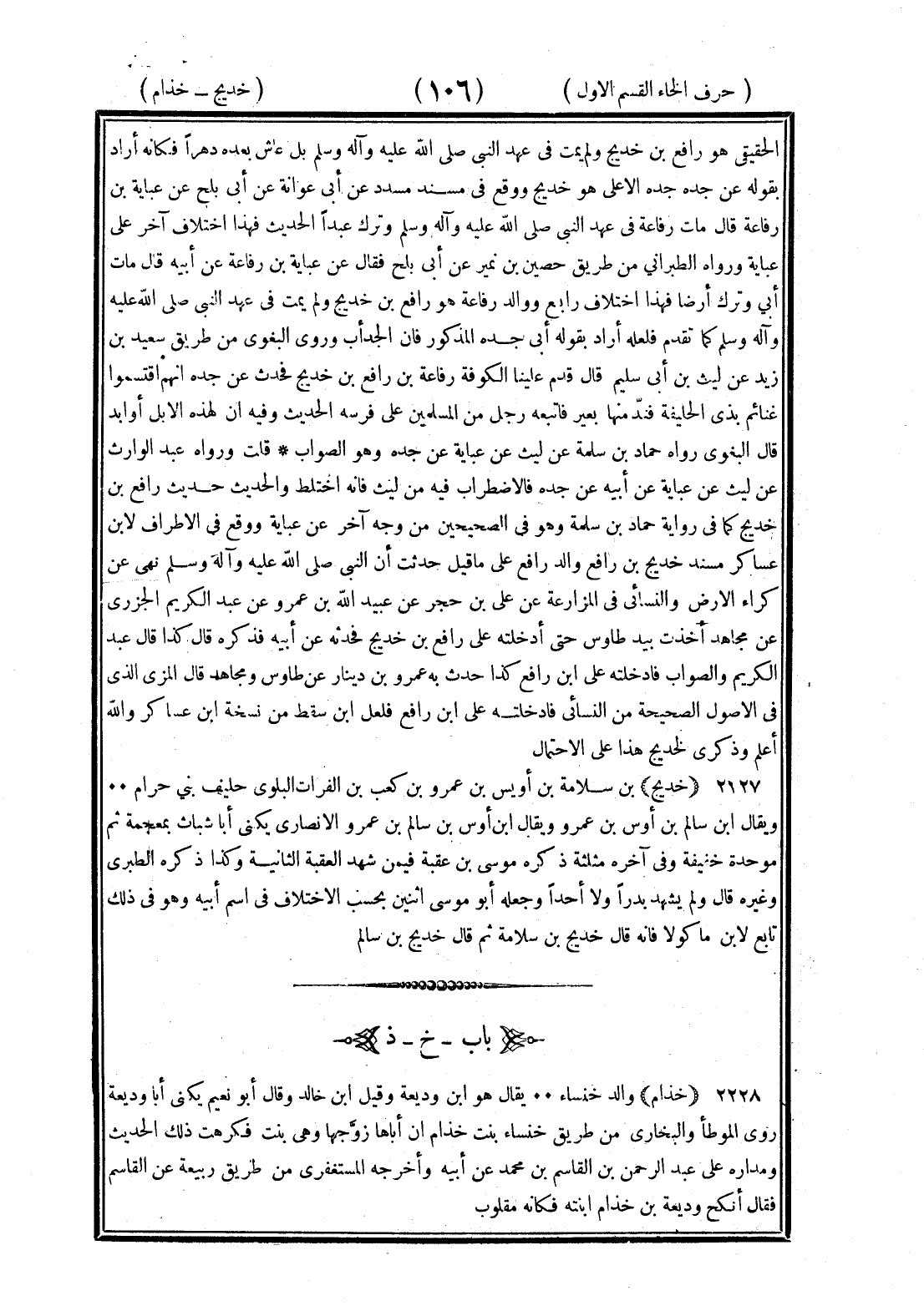 <106> الحقيقي هو رافع بن رافع بن خديج ولم يمت في عهد النبي صلى الله عليه وسلم بل عاش بعده دهرا فكأنه أراد بقوله عن جده الأعلى وهو خديج ووقع في مسند مسدد عن أبي عوانة عن أبي بلج عن عباية بن رفاعة قال مات رفاعة في عهد النبي صلى الله عليه وسلم وترك عبدا الحديث فهذا اختلاف آخر على عباية ورواه الطبراني من طريق حصين بن نمير عن أبي بلج فقال عن عباية بن رفاعة عن أبيه قال مات أبي وترك أرضا فهذا اختلاف رابع ووالد رفاعة هو رافع بن خديج ولم يمت في عهد رسول الله صلى الله عليه وسلم كما تقدم فلعله أراد بقوله أبي جده المذكور فإن الجد أبي وروى البغوي من طريق سعيد بن زيد عن ليث بن أبي سليم قال قدم علينا الكوفة رفاعة بن رافع بن خديج فحدث عن جده أنهم اقتسموا غنائم بذي الحليفة فند منها بعير فاتبعه رجل من المسلمين على فرسه الحديث وفيه إن لهذه الإبل أوابد قال البغوي رواه حماد بن سلمة عن ليث عن عباية عن جده وهو الصواب قلت ورواه عبد الوارث عن ليث عن عباية عن أبيه عن جده فالاضطراب فيه من ليث فإنه اختلط والحديث حديث رافع بن خديج كما في رواية حماد بن سلمة وهو في الصحيحين من وجه آخر عن عباية ووقع في الأطراف لابن عساكر مسندا خديج بن رافع والد رافع على ما قيل حدثت أن النبي صلى الله عليه وسلم نهى عن كرا الأرض والنسائي في المزارعة عن علي بن حجر عن عبيد الله بن عمرو عن عبد الكريم الجزري عن مجاهد أخذت بيد طاوس حتى أدخلته على رافع بن خديج فحدثه عن أبيه فذكره قال كذا قال عبد الكريم والصواب فأدخلته على بن رافع كذا حدث به عمرو بن دينار عن طاوس ومجاهد قال المزي الذي في الأصول الصحيحة من النسائي فأدخلته على بن رافع فلعل بن سقط من نسخة بن عساكر والله أعلم وذكرى لخديج هذا على الاحتمال خديج بن سلامة بن أوس بن عمرو بن كعب بن القراقر البلوي حليف بني حرام ويقال بن سالم بن أوس بن عمرو ويقال بن أوس بن سالم بن عمرو الأنصاري يكنى أبا شباث بمعجمة ثم موحدة خفيفة وفي آخره مثلثة ذكره موسى بن عقبة فيمن شهد العقبة الثانية وكذا ذكره الطبري وغيره قال ولم يشهد بدرا ولا أحدا وجعله أبو موسى اثنين بحسب الاختلاف في اسم أبيه وهو في ذلك تابع لابن ماكولا فإنه قال خديج بن سلامة ثم قال خديج بن سالم الخاء بعدها الذال خذام والد خنساء يقال هو بن وديعة وقيل بن خالد وقال أبو نعيم يكنى أبا وديعة وروى في الموطأ والبخاري من طريق خنساء بنت خذام أن أباها زوجها وهي ثيب فكرهت ذلك الحديث ومداره على عبد الرحمن بن القاسم بن محمد عن أبيه وأخرجه المستغفري من طريق ربيعة عن القاسم فقال أنكح وديعة بن خذام ابنته فكأنه مقلوب §