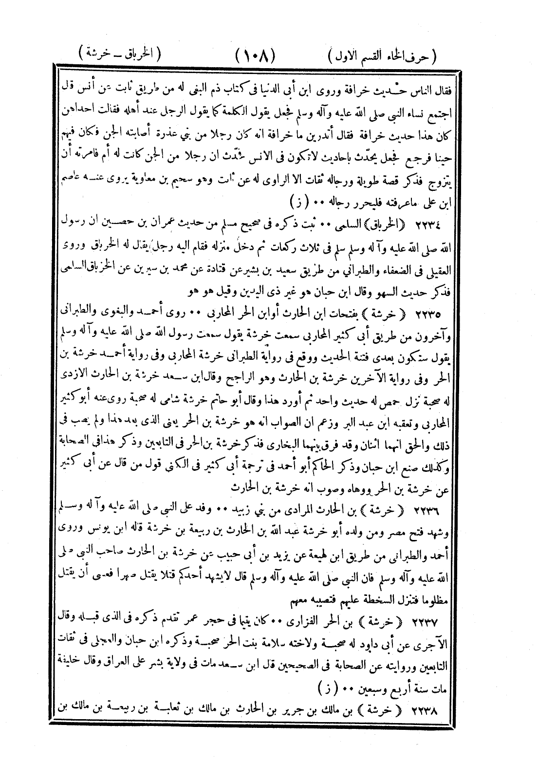 <108> فقال الناس حديث خرافة وروى بن أبي الدنيا في كتاب ذم البغي له من طريق ثابت عن أنس قال اجتمع نساء النبي صلى الله عليه وسلم فجعل يقول الكلمة كما يقول الرجل عند أهله فقالت إحداهن كأن هذا حديث خرافة فقال أتدرين ما خرافة إنه كان رجلا من بني عذرة أصابته الجن فكان فيهم حينا فرجع فجعل يحدث بأحاديث لا تكون في الإنس فحدث أن رجلا من الجن كانت له أم فأمرته أن يتزوج فذكر قصة طويلة ورجاله ثقات إلا الراوي له عن ثابت وهو سحيم بن معاوية يروي عنه عاصم بن علي ما عرفته فليحرر رجاله الخرباق السلمي ثبت ذكره في صحيح مسلم من حديث عمران بن حصين أن رسول الله صلى الله عليه وسلم سلم في ثلاث ركعات ثم دخل منزله فقام إليه رجل يقال له الخرباق وروى العقيلي في الضعفاء والطبراني من طريق سعيد بن بشير عن قتادة عن محمد بن سيرين عن الخرباق السلمي فذكر حديث السهو وقال بن حبان هو غير ذي اليدين وقيل هو هو خرشة بفتحات بن الحارث أو بن الحر المحاربي وروى أحمد والبغوي والطبراني وآخرون من طريق أبي كثير المحاربي سمعت خرشة يقول سمعت رسول الله صلى الله عليه وسلم يقول ستكون بعدي فتنة الحديث ووقع في رواية الطبراني خرشة المحاربي وفي رواية أحمد خرشة بن الحر وفي رواية الآخرين خرشة بن الحارث وهو الراجح وقال بن سعد خرشة بن الحارث الأسدي له صحبة نزل حمص له حديث واحد ثم أورد هذا وقال أبو حاتم خرشه شامي له صحبة وروى عنه أبو كثير المحاربي وتعقبه بن عبد البر وزعم أن الصواب أنه هو خرشة بن الحر يعني الذي بعد هذا ولم يصب في ذلك والحق أنهما اثنان وقد فرق بينهما البخاري فذكر خرشة بن الحر في التابعين وذكر هذا في الصحابة وكذلك صنع بن حبان وذكر الحاكم أبو أحمد في ترجمة أبي كثير في الكنى قول من قال عن أبي كثير عن خرشة بن الحر ووهاه وصوب أنه خرشة بن الحارث خرشة بن الحارث المرادي من بني زبيد وفد على النبي صلى الله عليه وسلم وشهد فتح مصر ومن ولده أبو خرشة عبد الله بن الحارث بن ربيعة بن خرشة قاله بن يونس وروى أحمد والطبراني من طريق بن لهيعة عن يزيد بن أبي حبيب عن خرشة بن الحارث صاحب النبي صلى الله عليه وسلم أن النبي صلى الله عليه وسلم قال لا يشهد أحدكم قتيلا يقتل صبرا فعسى أن يقتل مظلوما فتنزل السخطة عليهم فتصيبه معهم خرشة بن الحر الفزاري كان يتيما في حجر عمر تقدم ذكره في الذي قبله وقال الآجري عن أبي داود له صحبة ولأخته سلامة بنت الحر صحبة وذكره بن حبان والعجلي في ثقات التابعين وروايته عن الصحابة في الصحيحين قال بن سعد مات في ولاية بشر على العراق وقال خليفة مات سنة أربع وسبعين خرشة بن مالك بن جري بن الحارث بن مالك بن ثعلبة بن ربيعة بن مالك بن §