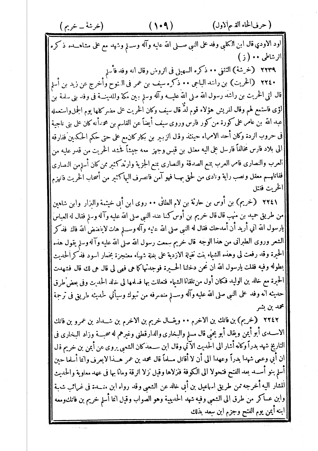 <109> أود الأودي قال بن الكلبي وفد على النبي صلى الله عليه وسلم وشهد مع علي مشاهده ذكره الرشاطي خرشة الثقفي ذكره السهيلي في الروض وقال إنه وفد فأسلم الخربت بن راشد الناجي ذكره سيف بن عمر في الفتوح وأخرج عن زيد بن أسلم قال لقي الخريت بن راشد رسول الله صلى الله عليه وسلم بين مكة والمدينة في وفد بني سامة بن لؤي فاستمع لهم وقال لقريش هؤلاء قوم لد قال سيف وكان الخريت على مضر كلها يوم الجمل واستعمله عبد الله بن عامر على كورة من كور فارس وروى سيف أيضا عن القاسم بن محمد أنه كان على بني ناجية في حروب الردة وكان أحد الأمراء حينئذ وقال الزبير بن بكار كان مع علي حتى حكم الحكمين ففارقه إلى بلاد فارس مخالفا فأرسل علي إليه معقل بن قيس وجهز معه جيشا فحشد الخريت من قدر عليه من العرب والنصارى فأمر العرب بمنع الصدقة والنصارى بمنع الجزية وارتد كثير ممن كان أسلم من النصارى فقاتلهم معقل ونصب راية ونادى من لحق بها فهو آمن فانصرف إليها كثير من أصحاب الخريت فانهزم الخريت فقتل خريم بن أوس بن حارثة بن لام الطائي روى بن أبي خيثمة والبزار وابن شاهين من طريق حميد بن منهب قال قال خريم بن أوس كنا عند النبي صلى الله عليه وسلم فقال له العباس يا رسول الله إني أريد أن أمدحك فقال له النبي صلى الله عليه وسلم هات لا يفضض الله فاك فذكر الحديث وروى الطبراني من هذا الوجه قال خريم سمعت رسول الله صلى الله عليه وسلم يقول هذه الحيرة وقد رفعت لي وهذه الشيماء بنت نقيلة الأزدية على بغلة شهباء معتجرة بخمار أسود فذكر الحديث بطوله وفيه فقلت يا رسول الله إن نحن دخلنا الحيرة فوجدتها كما هي فهي لي قال هي لك قال فشهدت الحيرة مع خالد بن الوليد فكان أول من تلقانا الشيماء فتعلقت بها فسلمها لي خالد الحديث وفي بعض طرق حديثه أنه وفد علي النبي صلى الله عليه وسلم منصرفه من تبوك وسيأتي لحديثه طريق في ترجمة محمد بن بشر خريم بن فاتك بن الأخرم ويقال خريم بن الأخرم بن شداد بن عمرو بن فاتك الأزدي أبو أيمن ويقال أبو يحيى قال مسلم والبخاري والدارقظني وغيرهم له صحبة وزاد البخاري في التاريخ شهد بدرا وكأنه أشار إلى الحديث الآتي وقال بن سعد كان الشعبي يروي عن أيمن بن خريم قال إن أبي وعمي شهدا بدرا وعهدا ألا أقاتل مسلما قال محمد بن عمر هذا لا يعرف وإنما أسلما حين أسلم بنو أسد بعد الفتح فتحولا إلى الكوفة فنزلاها وقيل نزلا الرقة وماتا بها في عهد معاوية والحديث المشار اليه أخرجه من طريق إسماعيل بن أبي خالد عن الشعبي وقد رواه بن منده في غرائب شعبة وابن عساكر من طرق إلى الشعبي وفيه شهد الحديبية وهو الصواب وقيل إنما أسلم خريم بن فاتك ومعه ابنه أيمن يوم الفتح وجزم بن سعد بذلك §