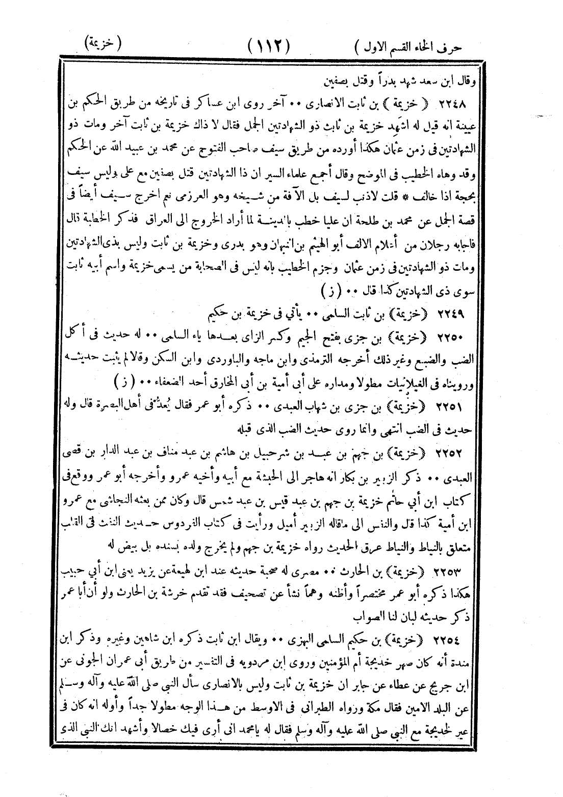 <112> وقال بن سعد شهد بدرا وقتل بصفين خزيمة بن ثابت الأنصاري آخر روى بن عساكر في تاريخه من طريق الحكم بن عتيبة أنه قيل له أشهد خزيمة بن ثابت ذو الشهادتين الجمل فقال لا ذاك خزيمة بن ثابت آخر ومات ذو الشهادتين في زمن عثمان هكذا أورده من طريق سيف صاحب الفتوح عن محمد بن عبيد الله عن الحكم وقد وهاه الخطيب في الموضح وقال أجمع علماء السير أن ذا الشهادتين قتل بصفين مع علي وليس سيف بحجة إذا خالف قلت لا ذنب لسيف بل الآفة من شيخه وهو العرزمي نعم أخرج سيف أيضا في قصة الجمل عن محمد بن طلحة أن عليا خطب بالمدينة لما أراد الخروج إلى العراق فذكر الخطبة قال فأجابه رجلان من أعلام الأنصار أبو الهيثم بن التيهان وهو بدري وخزيمة بن ثابت وليس بذي الشهادتين ومات ذو الشهادتين في زمن عثمان وجزم الخطيب بأنه ليس في الصحابة من يسمى خزيمة واسم أبيه ثابت سوى ذي الشهادتين كذا قال خزيمة بن ثاتب السلمي يأتي في خزيمة بن حكيم خزيمة بن جزي بفتح الجيم وكسر الزاي بعدها ياء السلمي له حديث في أكل الضب والضبع وغير ذلك أخرجه الترمذي وابن ماجة والباوردي وابن السكن وقال لم يثبت حديثه ورويناه في الغيلانيات مطولا ومداره على أبي أمية بن أبي المخارق أحد الضعفاء خزيمة بن جزي بن شهاب العبدي ذكره أبو عمر فقال يعد في أهل البصرة قال وله حديث في الضب انتهى وإنما روى حديث الضب الذي قبله خزيمة بن جهم بن عبد بن شرحبيل بن هاشم بن عبد مناف بن عبد الدار بن قصي العبدري ذكر الزبير بن بكار أنه هاجر إلى الحبشة مع أبيه وأخيه عمرو وأخرجه أبو عمر ووقع في كتاب بن أبي حاتم خزيمة بن جهم بن عبد قيس بن عبد شمس قال وكان ممن بعثه النجاشي مع عمرو بن أمية كذا قال والنفس إلى ما قاله الزبير أميل ورأيت في كتاب الفردوس حديث النفث في القلب متعلق بالنياط والنياط عرق الحديث ورواه خزيمة بن جهم ولم يخرج ولده سنده بل بيض له خزيمة بن الحارث مصري له صحبة حديثه عند بن لهيعة عن يزيد يعني بن أبي حبيب هكذا ذكره أبو عمر مختصرا وأظنه وهما نشأ عن تصحيف فقد تقدم خرشة بن الحارث ولو أن أبا عمر ذكر حديثه لبان لنا الصواب خزيمة بن حكيم السلمي البهزي ويقال بن ثابت ذكره بن شاهين وغيره وذكر بن منده أنه كان صهر خديجة أم المؤمنين وروى بن مردويه في التفسير من طريق أبي عمران الجوني عن بن جريج عن عطاء عن جابر أن خزيمة بن ثابت وليس بالأنصاري سأل النبي صلى الله عليه وسلم عن البلد الأمين فقال مكة ورواه الطبراني في الأوسط من هذا الوجه مطولا جدا وأوله أنه كان في عير لخديجة مع النبي صلى الله عليه وسلم فقال له يا محمد إني أرى فيك خصالا وأشهد أنك النبي الذي §