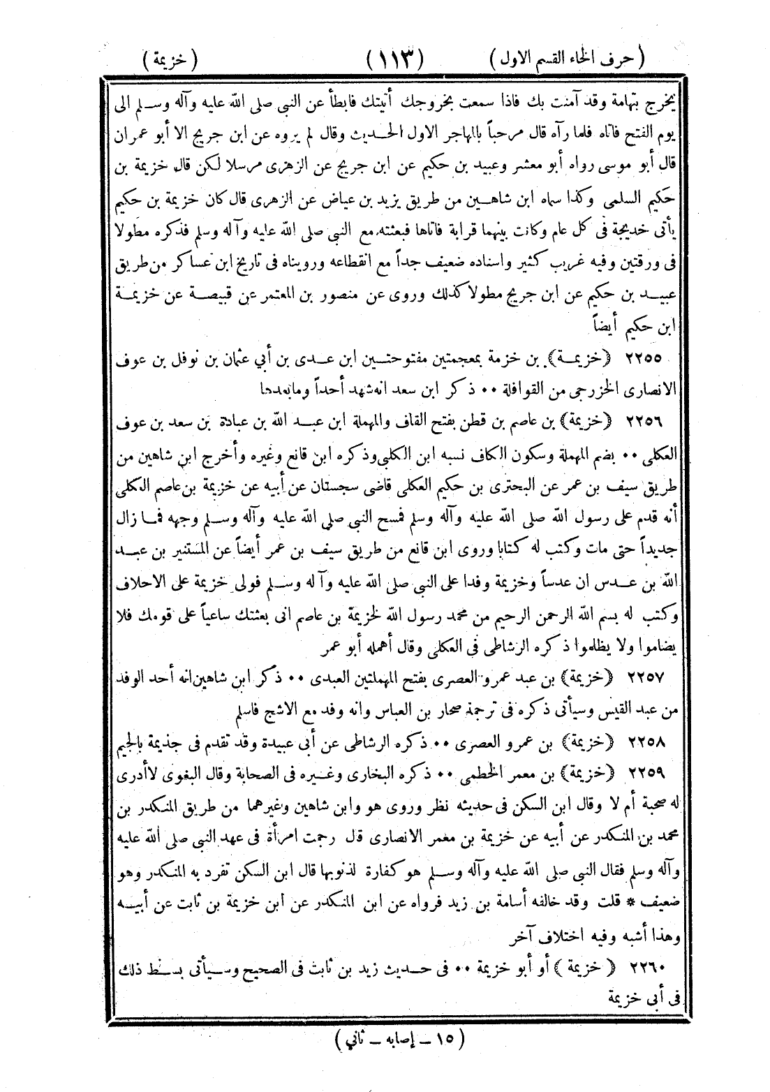 <113> يخرج بتهامة وقد آمنت بك فإذا سمعت بخروجك أتيتك فأبطأ عن النبي صلى الله عليه وسلم إلى يوم الفتح فأتاه فلما رآه قال مرحبا بالمهاجر الأول الحديث وقال لم يروه عن بن جريج إلا أبو عمران قال أبو موسى رواه أبو معشر وعبيد بن حكيم عن بن جريج عن الزهري مرسلا لكن قال خزيمة بن حكيم السلمي وكذا سماه بن شاهين من طريق يزيد بن عياض عن الزهري قال كان خزيمة بن حكيم يأتي خديجة في كل عام وكانت بينهما قرابة فأتاها فبعثته مع النبي صلى الله عليه وسلم فذكره مطولا في ورقتين وفي غريب كثير وإسناده ضعيف جدا مع انقطاعه ورويناه في تاريخ بن عساكر من طريق عبيد بن حكيم عن بن جريج مطولا كذلك وروي عن منصور بن المعتمر عن قبيصة عن خزيمة بن حكيم أيضا خزيمة بن خزمة بمعجمتين مفتوحتين بن عدي بن أبي عثمان بن قوقل بن عوف الأنصاري الخزرجي من القواقلة ذكر بن سعد أنه شهد أحدا وما بعدها خزيمة بن عاصم بن قطن بفتح القاف والمهملة بن عبد الله بن عبادة بن سعد بن عوف العكلي بضم المهملة وسكون الكاف نسبه بن الكلبي وذكره بن قانع وغيره وأخرج بن شاهين من طريق سيف بن عمر عن البختري بن حكيم العكلي أنه قدم على رسول الله صلى الله عليه وسلم فأسلم فمسح النبي صلى الله عليه وسلم فما زال جديدا حتى مات وكتب له كتابا وروى بن قانع من طريق سيف بن عمر أيضا عن المستنير بن عبد الله بن عدس أن عدسا وخزيمة وفدا على النبي صلى الله عليه وسلم فولى خزيمة على الأحلاف وكتب له بسم الله الرحمن الرحيم من محمد رسول الله لخزيمة بن عاصم إني بعثتك ساعيا على قومك فلا يضاموا ولا يظلموا ذكره الرشاطي في العكلي وقال أهمله أبو عمر خزيمة بن عبد عمرو العصري بفتح المهملتين العبدي ذكر بن شاهين أنه أحد الوفد من عبد القيس وسيأتي ذكره في ترجمة صحار بن العباس وأنه وفد مع الأشج فأسلم خزيمة بن عمرو العصري ذكره الرشاطي عن أبي عبيدة وقد تقدم في جزيمة بالجيم خزيمة بن معمر الخطمي ذكره البخاري وغيره في الصحابة وقال البغوي لا أدري له صحبة أم لا وقال بن السكن في حديثه نظر وروى هو وابن شاهين وغيرهما من طريق المنكدر بن محمد المنكدر عن أبيه عن خزيمة بن معمر الأنصاري قال رجمت امرأة في عهد النبي صلى الله عليه وسلم فقال النبي صلى الله عليه وسلم هو كفارة لذنوبها قال بن السكن تفرد به المنكدر وهو ضعيف قلت وقد خالفه أسامة بن زيد فرواه عن بن المنكدر عن بن خزيمة بن ثابت عن أبيه وهذا أشبه وفيه اختلاف آخر خزيمة أو أبو خزيمة في حديث زيد بن ثابت في الصحيح وسيأتي بسط ذلك في أبي خزيمة الخاء بعدها الشين §