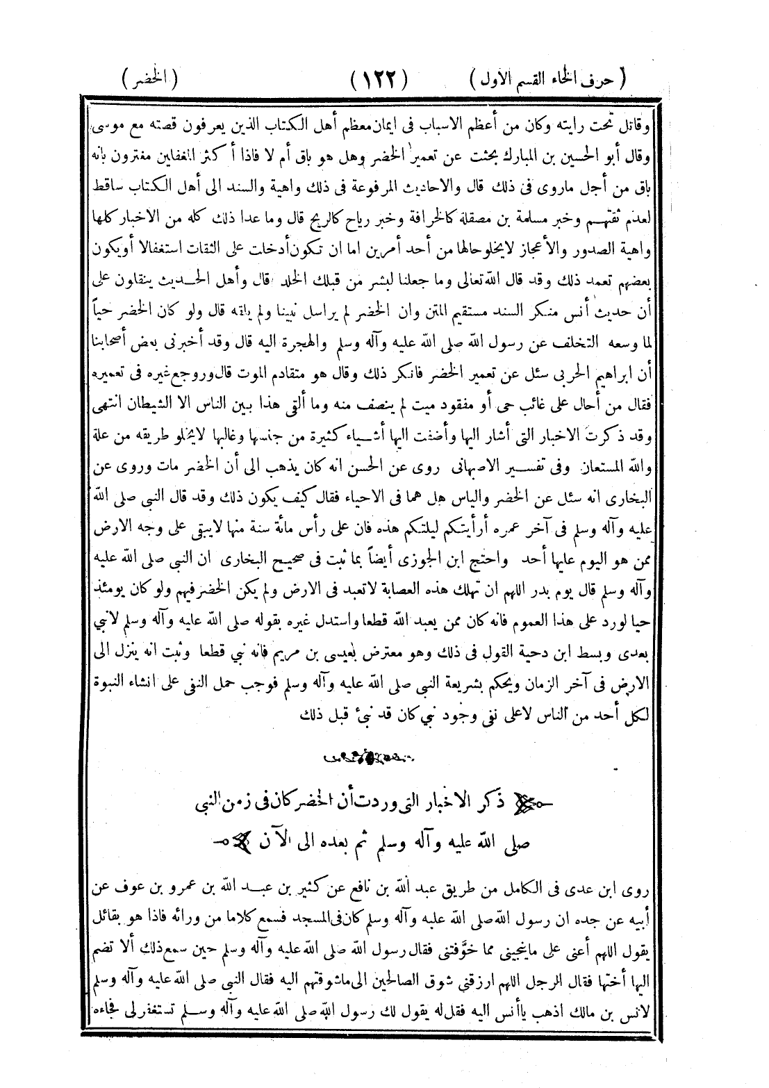 <122> وقاتل تحت رايته وكان من أعظم الأسباب في إيمان معظم أهل الكتاب الذي يعرفون قصته مع موسى وقال أبو الحسين بن المنادي بحثت عن تعمير الخضر وهل هو باق أم لا فإذا أكثر المغفلين مغترون بأنه باق من أجل ما روى في ذلك قال والأحاديث المرفوعة في ذلك واهية والسند إلى أهل الكتاب ساقط لعدم ثقتهم وخبر مسلمة بن مصقله كالخرافة وخبر رياح كالريح قال وما عدا ذلك كله من الأخبار كلها واهية الصدور والأعجاز لا يخلو حالها من أحد أمرين إما أن تكون أدخلت على الثقات استغفالا أو يكون بعضهم تعمد ذلك وقد قال الله تعالى وما جعلنا لبشر من قبلك الخلد قال وأهل الحديث يقولون إن حديث أنس منكر السند سقيم المتن وإن الخضر لم يراسل نبيا ولم يلقه قال ولو كان الخضر حيا لما وسعه التخلف عن رسول الله صلى الله عليه وسلم والهجرة إليه قال وقد أخبرني بعض أصحابنا أن إبراهيم الحربي سئل عن تعمير الخضر فأنكر ذلك وقال هو متقادم الموت قال وروجع غيره في تعميره فقال من أحال على غائب حي أو مفقود ميت لم ينتصف منه وما ألقى هذا بين الناس إلا الشيطان انتهى وقد ذكرت الأخبار التي أشار إليها وأضفت إليها أشياء كثيرة من جنسها وغالبها لا يخلو طريقه من علة والله المستعان وفي تفسير الأصبهاني روى عن الحسن أنه كان يذهب إلى أن الخضر مات وروى عن البخاري أنه سئل عن الخضر وإلياس هل هما في الأحياء فقال كيف يكون ذلك وقد قال النبي صلى الله عليه وسلم في آخر عمره أرأيتكم ليلتكم هذه فإن على رأس مائة سنة لا يبقى على وجه الأرض ممن هو اليوم عليها أحد واحتج بن الجوزي أيضا بما ثبت في صحيح البخاري أن النبي صلى الله عليه وسلم قال يوم بدر اللهم إن تهلك هذه العصابة لا تعبد في الأرض ولم يكن الخضر فيهم ولو كان يومئذ حيا لورد على هذا العموم فإنه كان ممن يعبد الله قطعا واستدل غيره بقوله صلى الله عليه وسلم لا نبي بعدي ونسب إلى بن دحية القول في ذلك وهو معترض بعيسى بن مريم فإنه نبي قطعا وثبت أنه ينزل إلى الأرض في آخر الزمان ويحكم بشريعة النبي صلى الله عليه وسلم فوجب حمل النفي على إنشاء النبوة لأحد من الناس لا على نفي وجود نبي كان قد نبىء قبل ذلك ذكر الأخبار التي وردت أن الخضر كان في زمن النبي صلى الله عليه وسلم ثم بعده إلى الآن روى بن عدي في الكامل من طريق عبد الله بن نافع عن كثير بن عبد الله بن عمر بن عوف عن أبيه عن جده أن رسول الله صلى الله عليه وسلم كان في المسجد فسمع كلاما من ورائه فإذا هو بقائل يقول اللهم أعني على ما ينجيني مما خوفتني فقال رسول الله صلى الله عليه وسلم حين سمع ذلك ألا تضم إليها أختها فقال الرجل اللهم ارزقني شوق الصالحين إلى ما شوقتهم إليه فقال النبي صلى الله عليه وسلم لأنس بن مالك اذهب يا أنس إليه فقل له يقول لك رسول الله صلى الله عليه وسلم تستغفر لي فجاءه §