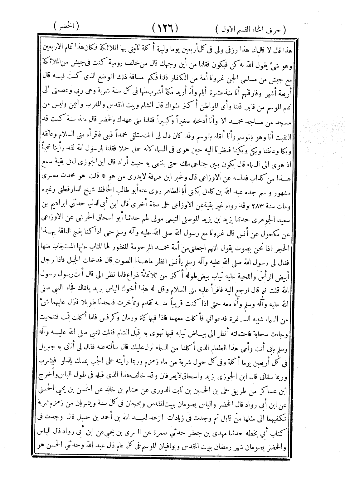 <126> هذا قال لا قال لنا هذا رزقي ولي في كل أربعين يوما وليلة أكلة تأتيني بها الملائكة فكان هذا تمام الأربعين وهو شيء يقول الله له كن فيكون فقلنا من أين وجهك قال من خلف رومية كنت في جيش من الملائكة مع جيش من مسلمي الجن غزونا أمة من الكفار قلنا فكم مسافة ذلك الموضع الذي كنت فيه قال أربعة أشهر وفارقتهم أنا منذ عشرة أيام وأنا أريد مكة أشرب منها في كل سنة شربة وهي ريي وعصمتي إلى تمام الموسم من قابل قلنا وأي المواطن أكثر مثواك قال الشام وبيت المقدس والمغرب واليمن وليس من مسجد من مساجد محمد إلا وأنا أدخله صغيرا أو كبيرا فقلنا متى عهدك بالخضر قال منذ سنة كنت قد التقيت أنا وهو بالموسم وأنا ألقاه بالموسم وقد كان قال لي إنك ستلقى محمدا فبلى فاقرأه مني السلام وعانقه وبكى وعانقنا وبكى وبكينا فنظرنا إليه حين هوى في السماء كأنه حمل حملا فقلنا يا رسول الله لقد رأينا عجبا إذ هوى إلى السماء قال يكون بين جناحي ملك حتى ينتهي به حيث أراد قال بن الجوزي لعل بقية سمع هذا من كذاب فدلسه عن الأوزاعي قال وخير بن عرفة لا يدري من هو قلت هو محدث مصري مشهور واسم جده عبد الله بن كامل يكنى أبا الطاهر روى عنه أبو طالب الحافظ به شيخ الدارقطني وغيره ومات سنة وقد رواه غير بقية عن الأوزاعي على صفة أخرى قال بن أبي الدنيا حدثني إبراهيم بن سعيد الجوهري حدثنا يزيد بن يزيد الموصلي التيمي مولى لهم حدثنا أبو إسحاق الجرشي عن الأوزاعي عن مكحول عن أنس قال غزونا مع رسول الله صلى الله عليه وسلم حتى إذا كنا بفج الناقة بهذا الحجر إذا نحن بصوت يقول اللهم اجعلني من أمة محمد المرحومة المغفور لها المتاب عليها المستجاب منها فقال لي رسول الله صلى الله عليه وسلم يا أنس انظر ما هذا الصوت قال فدخلت الجبل فإذا رجل أبيض الرأس واللحية عليه ثياب بيض طوله أكثر من ثلاثمائة ذراع فلما نظر إلي قال أنت رسول رسول الله قلت نعم قال ارجع إليه فاقرأ عليه مني السلام وقل له هذا أخوك إلياس يريد يلقاك فجاء النبي صلى الله عليه وسلم وأنا معه حتى إذا كنت قريبا منه تقدم وتأخرت فتحدثا طويلا فنزل عليهما شيء من السماء شبيه السفرة فدعواني فأكلت معهما فإذا فيها كمأة ورمان وكرفس فلما أكلت قمت فتنحيت وجاءت سحابة فاحتملته أنظر إلي بياض ثيابه فيها تهوى به قبل الشام فقلت للنبي صلى الله عليه وسلم بأبي أنت وأمي هذا الطعام الذي أكلنا من السماء نزل عليك قال سألته عنه فقال لي أتاني به جبريل لي كل أربعين يوما أكلة وفي كل حول شربة من ماء زمزم وربما رأيته على الجب يمسك بالدلو فيشرب وربما سقاني قال بن الجوزي يزيد وإسحاق لا يعرفان وقد خالف هذا الذي قبله في طول إلياس وأخرج بن عساكر من طريق علي بن الحسين بن الدوري عن هشام بن خالد عن الحسن بن يحيى الخشني عن بن أبي رواد قال الحضر وإلياس يصومان ببيت المقدس ويحجان في كل سنة ويشربان من زمزم شربة تكفيهما إلى مثلها من قابل ثم وجدت في زيادات الزهد لعبد الله بن أحمد بن حنبل قال وجدت في كتاب أبي بخطه حدثنا مهدي بن جعفر حدثني ضمرة عن السري بن يحيى عن بن أبي رواد قال إلياس والخضر يصومان شهر رمضان ببيت المقدس ويوافيان الموسم في كل عام قال عبد الله وحدثني الحسن هو §