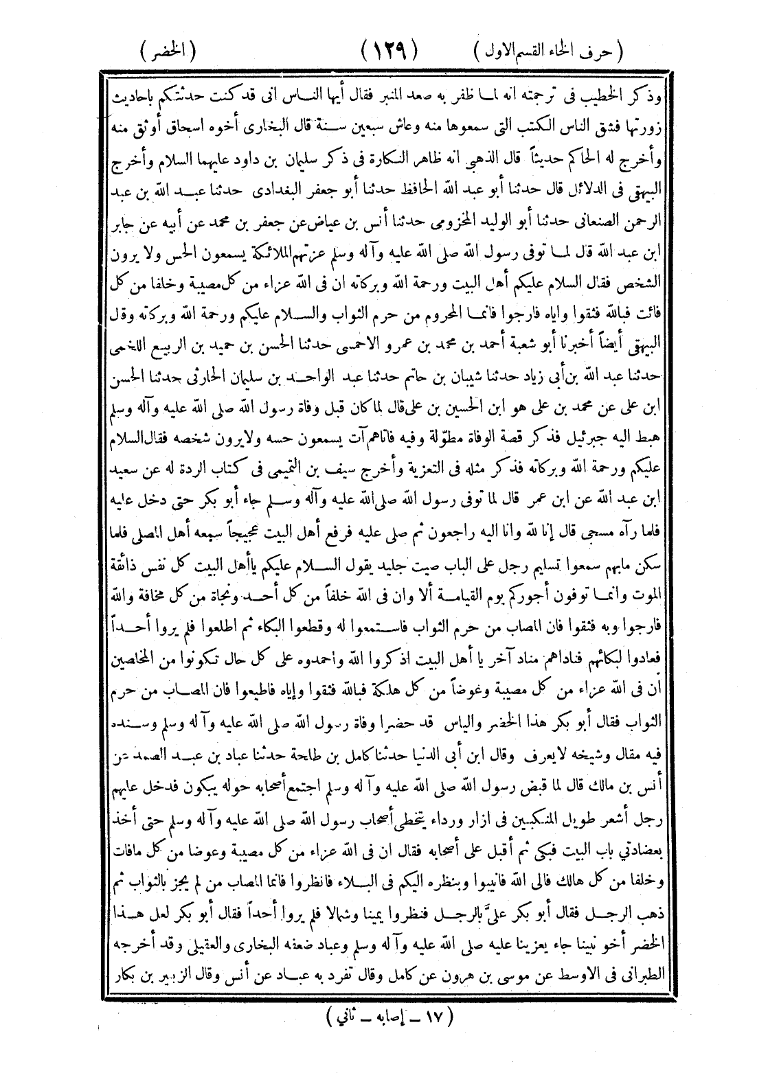 <129> وذكر الخطيب في ترجمته أنه لما ظفر به صعد المنبر فقال أيها الناس إني قد كنت حدثتكم بأحاديث زورتها فشق الناس الكتب التي سمعوها منه وعاش سبعين سنة قال البخاري أخوه إسحاق أوثق منه وأخرج له الحاكم حديثا قال الذهبي إنه ظاهر النكارة في ذكر سلمان بن داود عليهما السلام وأخرج البيهقي في الدلائل قال حدثنا أبو عبد الله الحافظ حدثنا أبو جعفر البغدادي حدثنا عبد الله بن عبد الرحمن الصنعاني حدثنا أبو الوليد المخزومي حدثنا أنس بن عياض عن جعفر بن محمد عن أبيه عن جابر بن عبد الله قال لما توفي رسول الله صلى الله عليه وسلم عزتهم الملائكة يسمعون الحس ولا يرون الشخص فقال السلام عليكم ورحمة الله وبركاته إن في الله عزاء من كل مصيبة وخلفا من كل فائت فبالله فثقوا وإياه فأرجوا فإنما المحروم من حرم الثواب والسلام عليكم ورحمة الله وبركاته وقال البيهقي أيضا أخبرنا أبو سعيد أحمد بن محمد بن عمرو الأحمسي حدثنا الحسن بن حميد بن الربيع اللخمي حدثنا عبد الله بن أبي زياد حدثنا سيار بن أبي حاتم حدثنا عبد الواحد بن سليمان الحارثي حدثنا الحسن بن علي عن محمد بن علي هو بن الحسين بن علي قال لما كان قبل وفاة رسول الله صلى الله عليه وسلم هبط إليه جبرائيل فذكر قصة الوفاة مطولة وفيه فأتاهم آت يسمعون حسه ولا يرون شخصه فقال السلام عليكم ورحمة الله وبركاته فذكر مثله في التعزية وأخرج سيف بن عمر التميمي في كتاب لردة له عن سعيد بن عبد الله عن بن عمر قال لما توفي رسول الله صلى الله عليه وسلم جاء أبو بكر حتى دخل عليه فلما رآه مسحى قال إنا لله وإنا إليه راجعون ثم صلى عليه فرفع أهل البيت عجيجا سمعه أهل المصلى فلما سكن ما بهم سمعوا تسليم رجل على الباب صيت جليد يقول السلام عليكم بأهل البيت كل نفس ذائقة الموت وإنما توفون أجوركم يوم القيامة ألا وإن في الله خلفا من كل أحد ونجاة من كل مخافة والله فأرجوا وبه فثقوا فإن المصاب من حرم الثواب فاستمعوا له وقطعوا البكاء ثم اطلعوا فلم يروا أحدا فعادوا لبكائهم فناداهم مناد آخر يأهل البيت اذكروا الله واحمدوه على كل حال تكونوا من المخلصين إن في الله عزاء من كل مصيبة وعوضا من كل هلكة فبالله فثقوا وإياه فأطيعوا فإن المصاب من حرم الثواب فقال أبو بكر هذا الخضر وإلياس قد حضرا وفاة رسول الله صلى الله عليه وسلم وسنده فيه مقال وشيخه لا يعرف وقال بن أبي الدنيا حدثنا كامل بن طلحة حدثنا عباد بن عبد الصمد عن أنس بن مالك قال لما قبض رسول الله صلى الله عليه وسلم اجتمع أصحابه حوله يبكون فدخل عليهم رجل أشعر طويل المنكبين في إزار ورداء يتخطى أصحاب رسول الله صلى الله عليه وسلم حتى أخذ بعضادتي باب البيت فبكى ثم أقبل على أصحابه فقال إن في الله عزاء من كل مصيبة وعوضا من كل ما فات وخلفا من كل هالك فإلى الله فأنيبوا وبنظره إليكم في البلاء فانظروا فإنما المصاب من لم يحز الثواب ثم ذهب الرجل فقال أبو بكر علي بالرجل فنظروا يمينا وشمالا فلم يروا أحدا فقال أبو بكر لعل هذا الخضر أخو نبينا جاء يعزينا عليه صلى الله عليه وسلم وعباد ضعفه البخاري والعقيلي وقد أخرجه الطبراني في الأوسط عن موسى بن أبي هارون عن كامل وقال تفرد به عباد عن أنس وقال الزبير بن بكار §