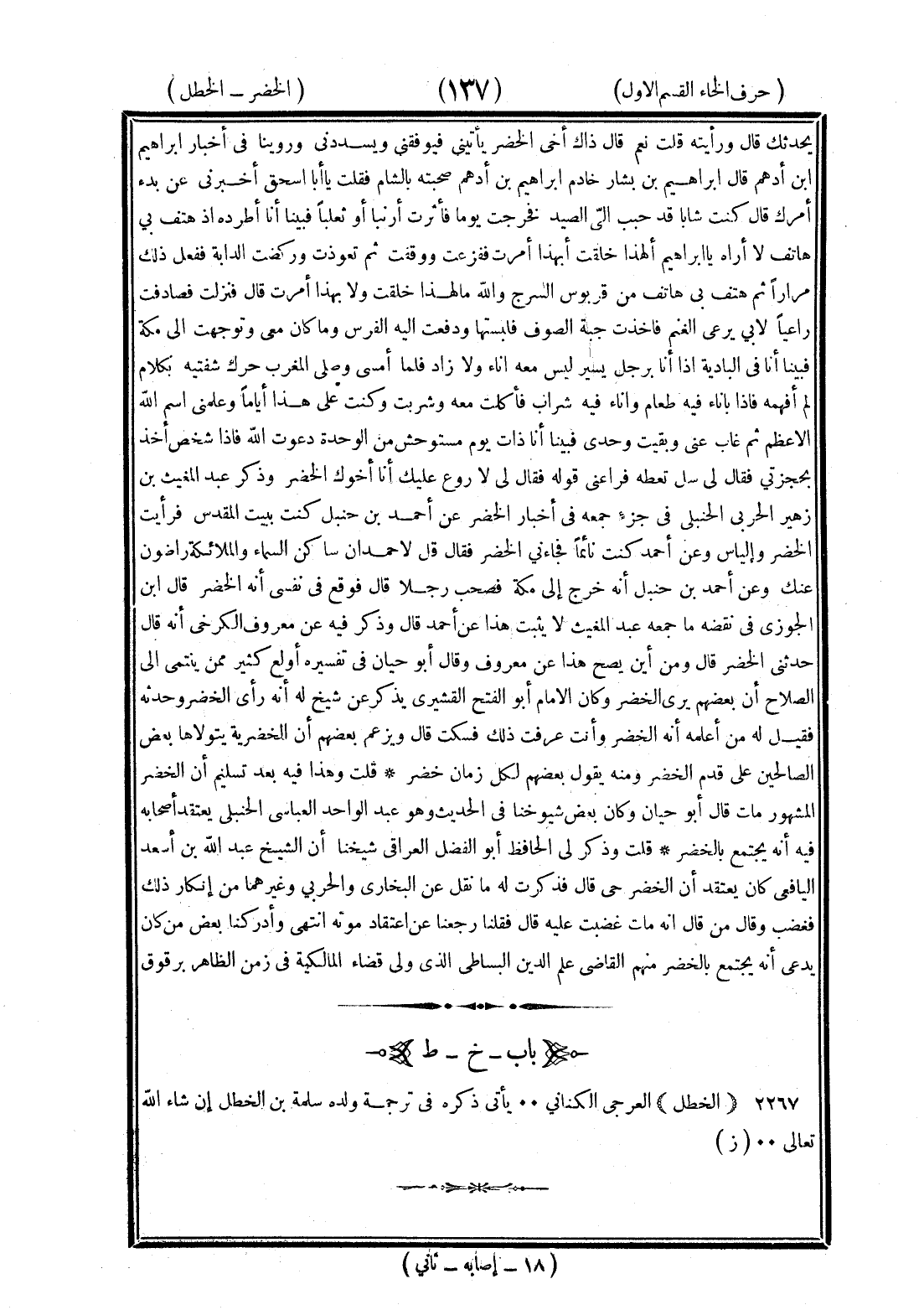 <137> يحدثك قال ورأيته قلت نعم قال ذاك أخي الخضر يأتيني فيوفقني ويسددني وروينا في أخبار إبراهيم بن أدهم قال إبراهيم بن بشار خادم إبراهيم بن أدهم صحبته بالشام فقلت يا أبا إسحاق أخبرني عن بدء أمرك قال كنت شابا قد حببت إلى الصيد فخرجت يوما فأثرت أرنبا أو ثعلبا فبينا أنا أطرده إذ هتف بي هاتف لا أراه يا إبراهيم ألهذا خلقت أبهذا أمرت ففزعت ووقفت ثم تعوذت وركضت الدابة ففعل ذلك مرارا ثم هتف بي هاتف من قربوس السرج والله ما لهذا خلقت ولا بهذا أمرت قال فنزلت فصادفت راعيا لأبي يرعي الغنم فأخذت جبة الصوف فلبستها ودفعت إليه الفرس وما كان معي وتوجهت إلى مكة فبينا أنا في البادية إذا أنا برجل يسير ليس معه إناء ولا زاد فلما أمسى وصلى المغرب حرك شفتيه بكلام لم أفهمه فإذا أنا بإناء فيه طعام وإناء فيه شراب فأكلت معه وشربت وكنت على هذا أياما وعلمني اسم الله الأعظم ثم غاب عني وبقيت وحدي فبينا أنا ذات يوم مستوحش من الوحدة دعوت الله فإذا شخص آخذ بحجزتي فقال لي سل تعطه فراعني قوله فقال لي لا روع عليك أنا أخوك الخضر وذكر عبد المغيث بن زهير الحربي الحنبلي في جزء جمعه في أخبار الخضر عن أحمد بن حنبل قال كنت ببيت المقدس فرأيت الخضر وإلياس وعن أحمد قال كنت نائما فجاءني الخضر فقال قل لأحمد إن ساكني السماء والملائكة راضون عنك وعن أحمد بن حنبل أنه أخرج إلى مكة فصحب رجلا قال فوقع في نفسي أنه الخضر قال بن الجوزي في نقض ما جمعه عبد المغيث لا يثبت هذا عن أحمد قال وذكر فيه عن معروف الكرخي أنه قال حدثني الخضر قال ومن أين يصح هذا عن معروف وقال أبو حيان في تفسيره أولع كثير ممن ينتمي إلى الصلاح أن بعضهم يرى الخضر وكان الإمام أبو الفتح القشيري يذكر عن شيخ له أنه رأى الخضر وحدثه فقيل له من أعلمه أنه الخضر أم كيف عرف ذلك فسكت قال ويزعم بعضهم أن الخضرية يتولاها بعض الصالحين على قدم الخضر ومنه قول بعضهم لكل زمان خضر قلت وهذا فيه بعد تسليم أن الخضر المشهور مات قال أبو حيان وكان بعض شيوخنا في الحديث وهو عبد الواحد العباسي الحنبلي يعتقد أصحابه فيه أنه يجتمع بالخضر قلت وذكر لي الحافظ أبو الفضل العراقي بن الحسين شيخنا أن الشيخ عبد الله بن أسعد اليافعي كان يعتقد أن الخضر حي قال فذكرت له ما نقل عن البخاري والحربي وغيرهما من إنكار ذلك فغضب وقال من قال إنه مات غضبت عليه قال فقلنا رجعنا عن اعتقاد موته انتهى وأدركنا بعض من كان يدعى أنه يجتمع بالخضر منهم القاضي علم الدين البساطي الذي ولي قضاء المالكية في زمن الظاهر برقوق والله والله تعالى أعلم وبغيبه أحكم الخاء بعدها الطاء الخطل العرجي الكناني يأتي ذكره في ترجمة ولده سلمة بن الخطل إن شاء الله تعالى §