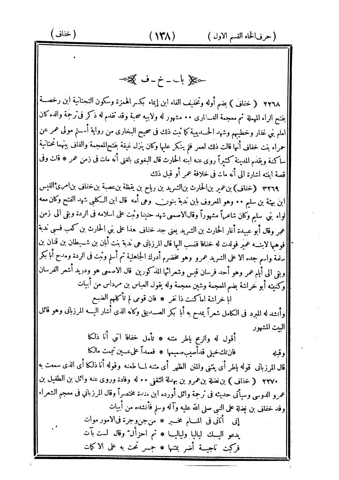<138> الخاء بعدها الفاء خفاف بضم أوله وتخفيف الفاء بن إيماء بكسر الهمزة وسكون التحتانية بن رخصة بفتح الراء المهملة ثم معجمة الغفاري مشهور وله ولأبيه صحبة وقد تقدم له ذكر في ترجمة والده كان إمام بني غفار وخطيبهم وشهد الحديبية كما ثبت ذلك في صحيح البخاري من رواية أسلم مولى عمر عن حمراء بنت خفاف أنها قالت ذلك لعمر فلم ينكر عليها وكان ينزل غيقة بفتح المعجمة والقاف بينهما تحتانية ساكنة ويقدم المدينة كثيرا وروى عنه ابنه الحارث قال البغوي بلغني أنه مات في زمن عمر قلت وفي قصة ابنته إشارة إلى أنه مات في خلافة عمر أو قبل ذلك خفاف بن عمير بن الحارث بن الشريد بن رياح بن يقظة بن عصية بن خفاف بن امرئ القيس بن بهثة بن سليم وهو المعروف بابن ندبة بنون وهي أمه قال بن الكلبي شهد الفتح وكان معه لواء بني سليم وكان شاعرا مشهورا وقال الأصمعي شهد حنينا وثبت على إسلامه في الردة وبقي إلى زمن عمر وقال أبو عبيدة أغار الحارث بن الشريد يعني جد خفاف هذا على بني الحارث بن كعب فسبي ندبة فوهبها لابنه عمير فولدت له خفافا فنسب إليها قال المرزباني هي ندبة بنت أبان بن شيطان بن قنان بن سلمة واسم جده الأعلى الشريد عمرو وهو مخضرم أدرك الجاهلية ثم أسلم وثبت في الردة ومدح أبا بكر وبقي إلى أيام عمر وهو أحد فرسان قيس وشعرائها المذكورين قال الأصمعي هو دريد أشعر الفرسان وكنيته أبو خراشة بضم المعجمة وشين معجمة وله يقول العباس بن مرداس من أبيات أبا خراشة أما أنت ذا نفر فإن قومي لم تأكلهم الضبع وأنشد له المبرد في الكامل شعرا يمدح به أبا بكر الصديق وكأنه الذي أشار إليه المرزباني وهو قائل البيت المشهور أقول له والرمح يأطر متنه تأمل خفاقا إنني أنا ذلكا وقبله فإن تك خيلي قد أصيب صميمها فعمدا على عيني تيممت مالكا قال المرزباني قوله يأطر أي يثنى والمتن الظهر أي متنه لما طعنه وقوله أنا ذلكا أي الذي سمعت به خفاف بن نضلة بن عمرو بن بهدلة الثقفي له وفادة وروى عنه ذابل بن الطفيل بن عمرو الدوسي وسيأتي حديثه في ترجمة ذابل أورده بن منده مختصرا وقال المرزباني في معجم الشعراء وفد خفاف بن نضلة على النبي صلى الله عليه وسلم فأنشده من أبيات إني أتاني في المنام مخبر من جن وجرة في الأمور موات يدعو إليك لياليا ولياليا ثم احز أل وقال لست بآت فركبت ناجية أضر بمتنها جمر تخب به على الأكمات §