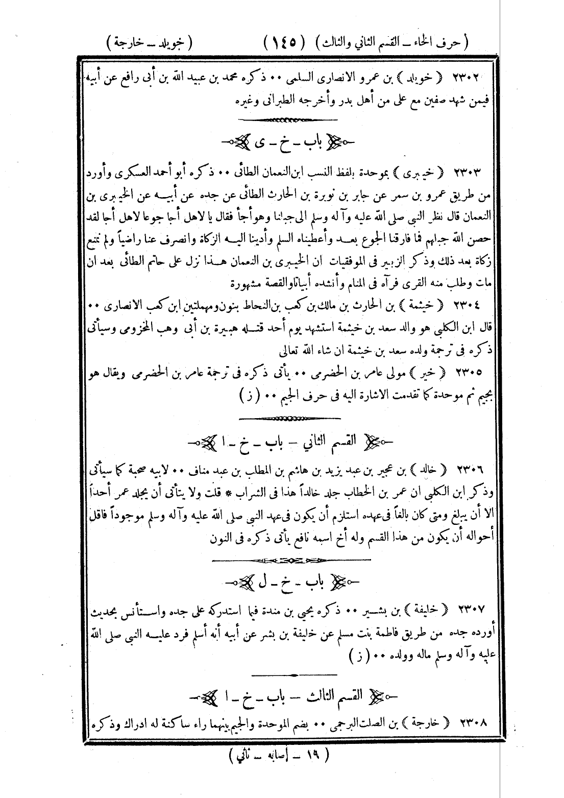 <145> خويلد بن عمرو الأنصاري السلمي ذكره محمد بن عبيد الله بن أبي رافع عن أبيه فيمن شهد صفين مع علي من أهل بدر وأخرجه الطبراني وغيره الخاء بعدها الياء خيبري بموحدة بلفظ النسب بن النعمان الطائي ذكره أبو أحمد العسكري وأورد من طريق عمرو بن شمر عن جابر بن نويرة بن الحارث الطائي عن جده عن أبيه عن الخيبري بن النعمان قال نظر النبي صلى الله عليه وسلم إلى جبلنا وهو أجأ فقال يا لأهل أجا جوعا لأهل أجأ لقد حصن الله جبلهم فما فارقنا الجوع بعد وأعطياه السلم وأدينا إليه الزكاة وانصرف عنا راضيا ولم نمنع زكاة بعد ذلك وذكر الزبير في الموقفيات أن الخيبري بن النعمان هذا نزل على حاتم الطائي بعد أن مات وطلب منه القرى فرآه في المنام وأنشده أبياتا والقصة مشهورة خيثمة بن الحارث بن مالك بن كعب بن النحاط بنون ومهملتين بن غنم الأنصاري قال بن الكلبي هو والد سعد بن خيثمة استشهد يوم أحد قتله هبيرة بن أبي وهب المخزومي وسيأتي ذكره في ترجمة ولده سعد بن خيثمة إن شاء الله تعالى خير مولى عامر بن الحضرمي يأتي ذكره في ترجمة عامر بن الحضرمي ويقال هو بجيم ثم موحدة كما تقدمت الإشارة إليه في حرف الجيم الخاء بعدها الألف القسم الثاني خالد بن عجير بن عبد يزيد بن هاشم بن عبد المطلب بن عبد مناف لأبيه صحبة كما سيأتي وذكر بن الكلبي أن عمر بن الخطاب جلد خالدا هذا في الشراب قلت ولا يتأنى أن يجلد عمر أحدا إلا أن يبلغ ومتى كان بالغا في عهده استلزم أن يكون في عهد النبي صلى الله عليه وسلم موجودا فأقل أحواله أن يكون من هذا القسم وله أخ اسمه نافع يأتي ذكره في النون الخاء بعدها اللام خليفة بن بشر ذكره يحيى بن منده فيمن استدركه على جده واستأنس بحديث أورده جده من طريق فاطمة بنت مسلم عن خليفة بن بشر عن أبيه أنه أسلم فرد عليه النبي صلى الله عليه وسلم ماله وولده الحديث القسم الثالث الخاء بعدها الألف خارجة بن الصلت البرجمي بضم الموحدة والجيم بينهما راء ساكنة له إدراك وذكره §