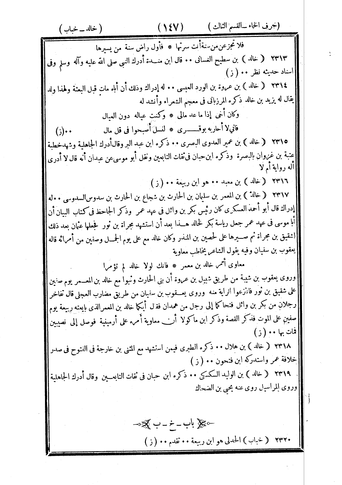 <147> فلا تجز عن من سيرة أنت سرتها فأول راض سيرة من يسيرها خالد بن سطيح الغساني قال بن منده أدرك النبي صلى الله عليه وسلم وفي إسناد حديثه نظر خالد بن عروة بن الورد العبسي له إدراك وذلك أن أباه مات قبل البعثة ولهذا ولد يقال له يزيد بن خالد ذكره المرزباني في معجم الشعراء وأنشد له وكان أخي إذا ما عد مالي وكنت عياله دون العيال فإني لا أجازيه بوفري لنسل أصبحوا في قل مالي خالد بن عمير العدوي البصري ذكره بن عبد البر وقال أدرك الجاهلية وشهد خطبة عتبة بن غزوان بالبصرة وذكره بن حبان في ثقات التابعين ونقل أبو موسى عن عبدان أنه قال لا أدري أله رواية أم لا خالد بن معبد هو بن ربيعة خالد بن المعمر بن سليمان بن الحارث بن شجاع بن الحارث بن سدوس السدوسي له إدراك قال أبو أحمد العسكري كان رئيس بكر بن وائل في عهد عمر وذكر الجاحظ في كتاب البيان أن أبا موسى في عهد عمر جعل رياسة بكر لخالد هذا بعد أن استشهد مجزأة بن ثور فجعلها عثمان بعد ذلك لشقيق بن مجزأة ثم صيرها علي لحصين بن المنذر وكان خالد مع علي يوم الجمل وصفين من أمرائه قاله يعقوب بن سفيان وفيه يقول الشاعر يخاطب معاوية معاوي أمر خالد بن معمر فإنك لولا خالد لم تؤمرا وروى يعقوب بن شيبة من طريق شبيل بن عزرة أن بني الحارث وثبوا مع خالد بن المعمر يوم صفين على شقيق بن ثور فانتزعوا الراية منه وروى يعقوب بن سفيان من طريق مضارب العجلي قال تفاخر رجلان من بكر بن وائل فتحا كما إلى رجل من همدان فقال أيكما خالد بن المعمر الذي بايعته ربيعة يوم صفين على الموت فذكر القصة وذكر بن ماكولا أن معاوية أمره على أرمينية فوصل إلى نصيبين فمات بها خالد بن هلال ذكره الطبري فيمن استشهد مع المثنى بن حارثة في الفتوح في صدر خلافة عمر واستدركه بن فتحون خالد بن الوليد السكسكي ذكره بن حبان في ثقات التابعين وقال أدرك الجاهلية وروى المراسيل روى عنه يحيى بن الضحاك الخاء بعدها الباء خباب الحدلي هو بن ربيعة تقدم §