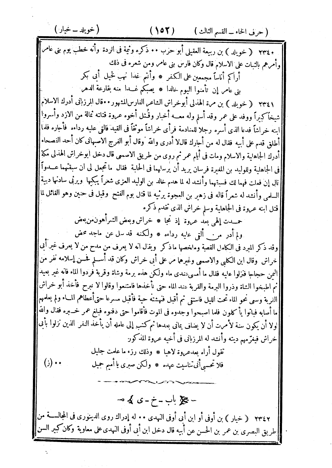 <152> خويلد بن ربيعة العقيلي أبو حرب ذكره وثيمة في الردة وأنه خطب قومه بني عامر وأمرهم بالثبات على الإسلام قال وكان فارس بني عامر ومن شعره في ذلك أراكم أناسا مجمعين على الكفر وأنتم غدا نهب لخيل أبي بكر بني عامر إن تأمنوا اليوم خالدا يصبكم غدا منه بقارعة الدهر خويلد بن مرة الهذلي أبو خراش الشاعر الفارس المشهور قال المرزباني أدرك الإسلام شيخا كبيرا ووفد على عمر وقد أسلم وله معه أخبار وقتل أخوه عروة قتلته ثمالة من الأزد وأسروا ابنه خراشا فدعا الذي أسره رجلا للمنادمة فرأى خراشا موثقا في القيد فألقى عليه رداءه فأجاره فلما أطلق قدم على أبيه فقال له من أجارك قال لا أدري والله وقال أبو الفرج الأصبهاني كان أحد الفصحاء أدرك الجاهلية والإسلام ومات في أيام عمر ثم روى من طريق الأصمعي قال دخل أبو خراش الهذلي مكة في الجاهلية وللوليد بن المغيرة فرسان يريد أن يرسلهما في الحلبة فقال ما تجعل لي إن سبقتهما عدوا قال إن فعلت فهما لك فسبقهما وأنشد له لما هدم خالد بن الوليد العزي شعرا يبكيها ويرثي سادنها دبية السلمي وأنشد له شعرا قاله في زهير بن العجوة يرثيه لما قتل يوم الفتح وقيل في حنين وهو القائل لما قتل ابنه عروة في الجاهلية وسلم خراش الذي تقدم ذكره حمدت إلهي بعد عروة إذ نجا خراش وبعض الشر أهون من بعض ولم أدر من ألقى عليه رداءه ولكنه قد سل عن ماجد محض وقد ذكر المبرد في الكامل القصة وملخصها ما ذكر ويقال إنه لا يعرف من مدح من لا يعرف غير أبي خراش وقال بن الكلبي والأصمعي وغيرهما مر علي أبي خراش وكان قد أسلم فحسن إسلامه نفر من اليمن وكانوا حجاجا فنزلوا عليه فقال ما أمسى عندي ماء ولكن هذه برمة وشاة وقربة فردوا الماء فإنه غير بعيد ثم اطبخوا الشاة وذروا البرمة والقربة عند الماء حتى نأخذها فامتنعوا وقالوا لا نبرح فأخذ أبو خراش القربة وسعى نحو الماء تحت الليل فاستقى ثم أقبل فنهشته حية فأقبل مسرعا حتى أعطاهم الماء ولم يعلمهم ما أصابه فباتوا يأكلون فلما أصبحوا وجدوه في الموت فأقاموا حتى دفنوه فبلغ عمر خبره فقال والله لولا أن يكون سنة لأمرت ألا يضاف يماني بعدها ثم كتب إلى عامله أن يأخذ النفر الذين نزلوا بأبي خراش فيغرمهم ديته وأنشد له المرزباني في أخيه عروة المذكور تقول أراه بعد عروة لاهيا وذلك رزء ما عملت جليل فلا تحسبي أني تناسيت عهده ولكن صبري يا أميم جميل الخاء بعدها الياء خيار بن أوفى أو بن أوفى النهدي له إدراك روى الدينوري في المجالسة من طريق النضر عن عمر بن الحسن عن أبيه قال دخل بن أبي أوفى النهدي على معاوية وكان كبير السن §
