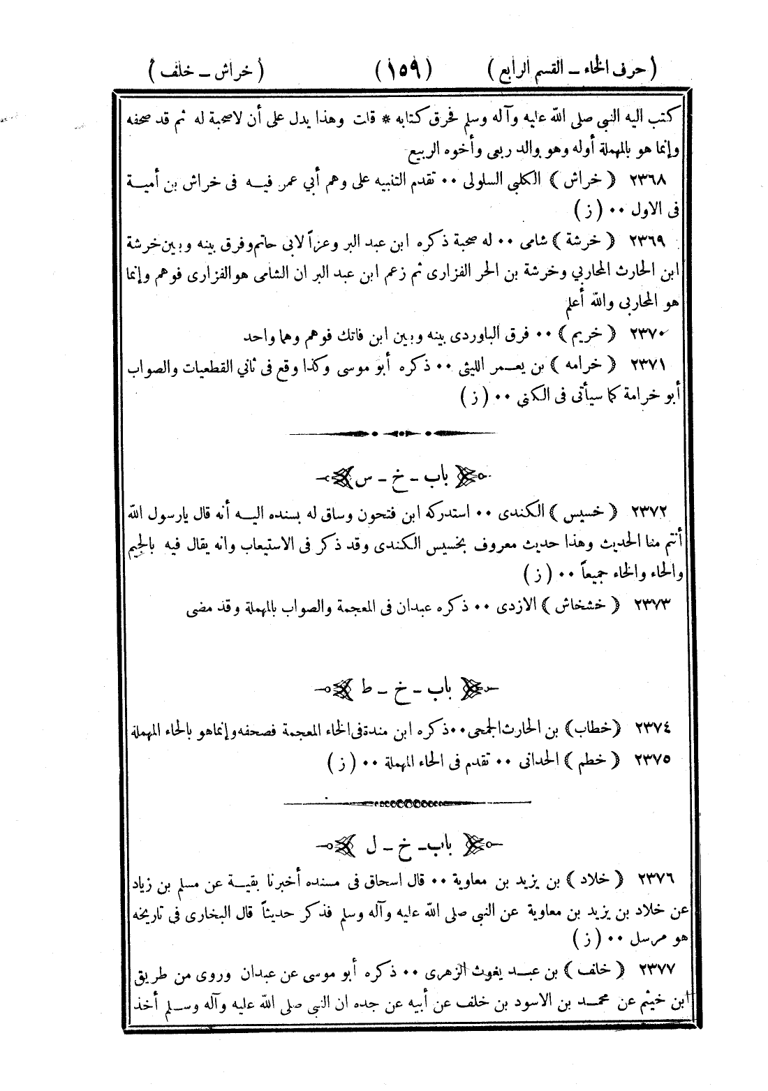 <159> كتب إليه النبي صلى الله عليه وسلم فحرق كتابه قلت وهذا يدل على أن لا صحبة له ثم قد صحفه وإنما هو بالمهملة أوله وهو والد ربعي وأخيه الربيع خراش الكلبي السلولي تقدم التنبيه على وهم أبي عمر فيه في خراش بن أمية في الأول خرشة شامي له صحبة ذكره بن عبد البر وعزاه لأبي حاتم وفرق بينه وبين خرشة بن الحارث المحاربي وخرشة بن الحر الفزاري ثم زعم بن عبد البر أن الشامي هو الفزاري فوهم وإنما هو المحاربي والله أعلم خريم فرق الباوردي بينه وبين بن فاتك فوهم وهما واحد خزامة بن يعمر الليثي ذكره أبو موسى وكذا وقع في ثاني القطيعات والصواب أبو خزامة كما سيأتي في الكنى الخاء بعدها السين خسيس الكندي استدركه بن فتحون وساق بسنده إليه أنه قال يا رسول الله أنتم منا الحديث وهذا حديث معروف بخسيس الكندي وقد ذكر في الاستيعاب وأنه يقال فيه بالجيم والخاء والحاء جميعا خشخاش الأزدي ذكره عبدان في المعجمة والصواب بالمهملة وقد مضى الخاء بعدها الطاء خطاب بن الحارث الجمحي ذكره بن منده في الخاء المعجمة فصحفه وإنما هو بالحاء المهملة خطيم الحداني تقدم في الحاء المهملة الخاء بعدها اللام خلاد بن يزيد بن معاوية قال إسحاق في مسنده أخبرنا بقية عن مسلم بن زياد عن خلاد بن يزيد بن معاوية عن النبي صلى الله عليه وسلم فذكر حديثا قال البخاري في تاريخه هو مرسل خلف بن عبد يغوث الزهري ذكره أبو موسى عن عبدان وروى من طريق بن خثيم عن محمد بن الأسود بن خلف عن أبيه عن جده أن النبي صلى الله عليه وسلم أخذ §