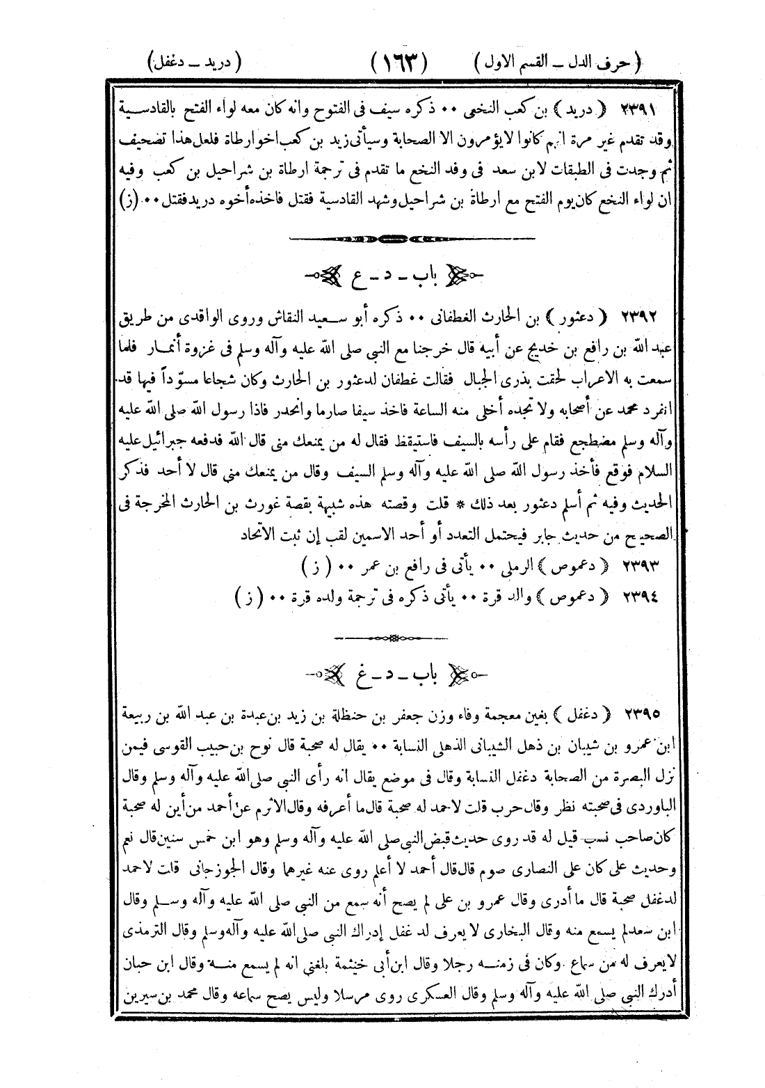 <163> دريد بن كعب النخعي ذكره سيف في الفتوح وأنه كان معه لواء الفتح بالقادسية وقد تقدم غير مرة أنهم كانوا لا يؤمرون إلا الصحابة وسيأتي زيد بن كعب أخو أرطاة فلعل هذا تصحيف ثم وجدت في الطبقات لابن سعد في وفد لالنجع ما تقدم في ترجمة أرطاة بن شراحيل بن كعب وفيه إن لواء النخع كان يوم الفتح مع أرطاة بن شراحيل وشهد القادسية فقتل فأخذه أخوه دريد فقتل الدال بعدها العين دعثور بن الحارث الغطفاني ذكره أبو سعيد النقاش وروى الواقدي من طريق عبد الله بن رافع بن خديج عن أبيه قال خرجنا مع النبي صلى الله عليه وسلم في غزوة أنمار فلما سمعت به الأعراب لحقت بدري الجبال فقالت غطفان لد عثور بن الحارث وكان شجاعا مسودا فيها قد انفرد محمد عن أصحابه ولا نجده أخلى منه الساعة فأخذ سيفا صارما وانحدر فإذا رسول الله صلى الله عليه وسلم مضطجع فقام على رأسه بالسيف فاستيقظ فقال له من يمنعك مني قال الله فدفعه جبرائيل عليه السلام فوقع فأخذ رسول الله صلى الله عليه وسلم السيف وقال من يمنعك مني قال لا أحد فذكر الحديث وفيه ثم أسلم دعثور بعد ذلك قلت وقصته هذه شبيهة بقصة غورث بن الحارث المخرجة في الصحيح من حديث جابر فيحتمل التعدد أو أحد الاسمين لقب إن ثبت الاتحاد دعموص الرملي يأتي في رافع بن عمرو دعموص والد قرة يأتي ذكره في ترجمة والده قرة الدال بعدها العين دغفل بغين معجمة وفاء وزن جعفر بن حنظلة بن زيد بن عبدة بن عبد الله بن ربيعة بن عمرو بن شيبان بن ذهل الشيباني الذهلي النسابة يقال له صحبة قال نوح بن أبي حبيب القومسي فيمن نزل البصرة من الصحابة دغفل النسابة وقال في موضع يقال إنه رأى النبي صلى الله عليه وسلم وقال الباوردي في صحبته نظر وقال حرب قلت لأحمد له صحبة قال ما أعرفه وقال الأثرم عن أحمد من أين له صحبة كان صاحب نسب قيل له قد روى حديث قبض النبي صلى الله عليه وسلم وهو بن خمس سنين قال نعم وحديث علي كان على النصارى صوم قال قال أحمد لا أعلم روى عنه غيرهما وقال الجوزجاني قلت لأحمد لدغفل صحبة قال ما أدري وقال عمرو بن علي لم يصح أنه سمع من النبي صلى الله عليه وسلم وقال بن سعد لم يسمع منه وقال البخاري لا يعرف لدغفل إدراك النبي صلى الله عليه وسلم وقال الترمذي لا يعرف له منه سماع وكان في زمنه رجلا وقال بن أبي خيثمة بلغني أنه لم يسمع منه وقال بن حبان أدرك النبي صلى الله عليه وسلم وقال العسكري روى مرسلا وليس يصح سماعه وقال محمد بن سيرين §