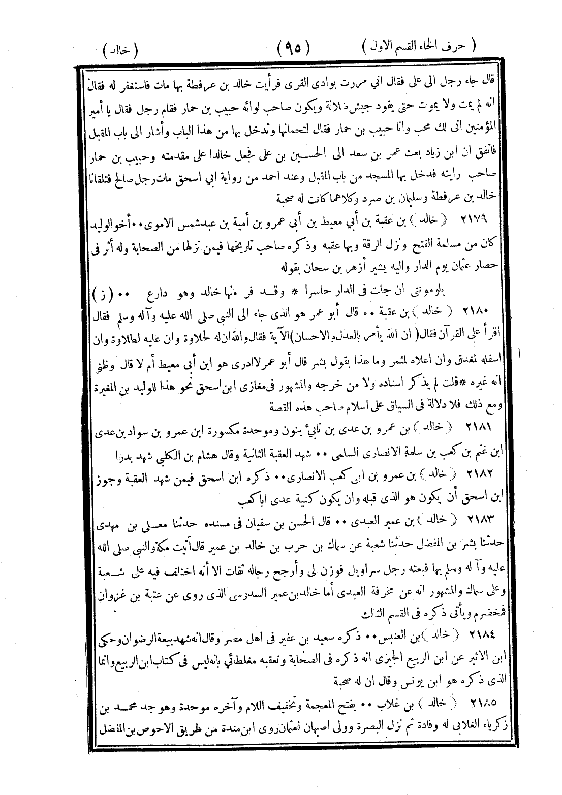 <95> قال جاء رجل إلى علي فقال إني مررت بوادي القرى فرأيت خالد بن عرفطة بها مات فاستغفر له فقال إنه لم يمت ولا يموت حتى يقود جيش ضلالة ويكون صاحب لوائه حبيب بن حمار فقام رجل فقال يا أمير المؤمنين إني لك محب وأنا حبيب بن حمار فقال لتحملنها وتدخل بها من هذا الباب وأشار إلى باب المقبل فاتفق أن بن زياد بعث عمر بن سعد إلى الحسين بن علي فجعل خالدا على مقدمته وحبيب بن حمار صاحب رايته فدخل بها المسجد من باب المقبل وعند أحمد من رواية أبي إسحاق مات رجل صالح فتلقانا خالد بن عرفطة وسليمان بن صرد وكلاهما كانت له صحبة خالد بن عقبة بن أبي معيط بن أبي عمرو بن أمية بن عبد شمس الأموي أخو الوليد كان من مسلمة الفتح ونزل الرقة وبها عقبة وذكره صاحب تاريخها فيمن نزلها من الصحابة وله أثر في حصار عثمان يوم الدار وإليه يشير أزهر بن سيحان بقوله يلومونني أن جلت في الدار حاسرا وقد فر منها خالد وهو دارع خالد بن عقبة قال أبو عمر هو الذي جاء إلى النبي صلى الله عليه وسلم فقال اقرأ علي القرآن فقرأ إن الله يأمر بالعدل والإحسان الآية فقال والله إن له لحلاوة وإن عليه لطلاوة وإن أسفله لمغدق وإن أعلاه لمثمر وما هذا بقول بشر قال أبو عمر لا أدري هو بن أبي معيط أم لا وظني أنه غيره قلت لم يذكر إسناده ولا من خرجه والمشهور في مغازي بن إسحاق نحو هذا للوليد بن المغيرة ومع ذلك فلا دلالة في السياق على إسلام صاحب هذه القصة خالد بن عمرو بن عدي بن نابي بنون وموحدة مكسورة بن عمرو بن سواد بن عدي بن غنم بن كعب بن سلمة الأنصاري السلمي شهد العقبة الثانية وقال هشام بن الكلبي شهد بدرا خالد بن عمرو بن أبي كعب الأنصاري ذكره بن إسحاق فيمن شهد العقبة وجوز بن إسحاق أن يكون هو الذي قبله وأن يكون كنية عدي أبا كعب خالد بن عمير العبدي قال الحسن بن سفيان في مسنده حدثنا معلى بن مهدي حدثنا بشر بن المفضل حدثنا شعبة عن سماك بن حرب عن خالد بن عمير قال أتيت مكة والنبي صلى الله عليه وسلم بها فبعته رجل سراويل فوزن لي وأرجح رجاله ثقات إلا أنه اختلف فيه على شعبة وعلى سماك والمشهور أنه عن مخرمة العبدي أما خالد بن عمير السدوسي الذي روى عن عتبة بن غزوان فمخضرم ويأتي ذكره في القسم الثالث خالد بن العنبس ذكره سعيد بن عفير في أهل مصر وقال إنه شهد بيعة الرضوان وحكى بن الأثير عن أبي الربيع الجيزي أنه ذكره في الصحابة وتعقبه مغلطاي بأنه ليس في كتاب أبي الربيع وإنما الذي ذكره هو بن يونس وقال إن له صحبة خالد بن غلاب بفتح المعجمة وتخفيف اللام وآخره موحدة وهو جد محمد بن زكريا الغلابي له وفادة ثم نزل البصرة وولي أصبهان لعثمان روى بن منده من طريق الأحوص بن المفضل §