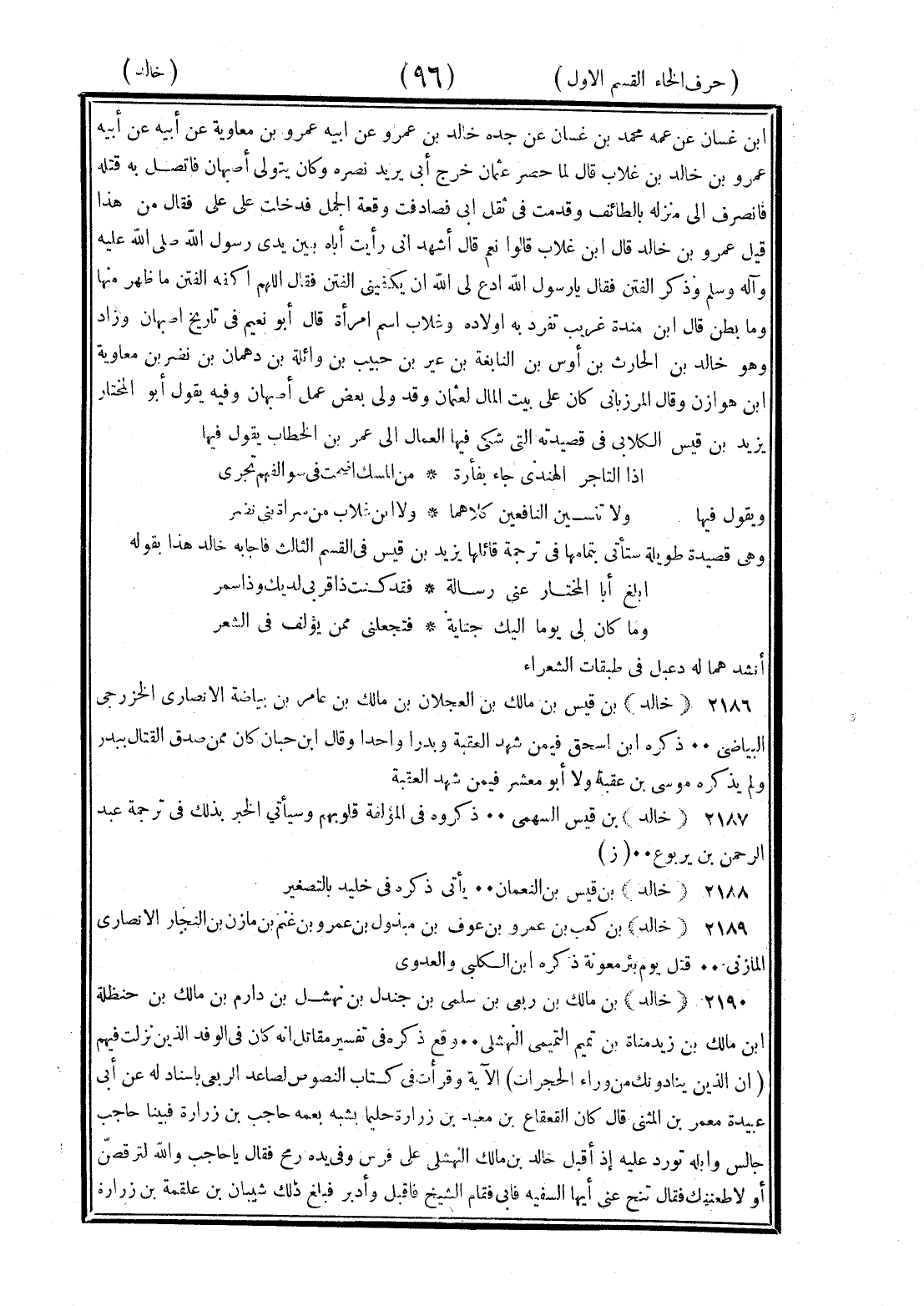 <96> بن غسان عن عمه محمد بن غسان عن جده بن عمرو عن أبيه عمرو بن معاوية عن أبيه عمرو بن خالد بن غلاب قال لما حضر عثمان خرج أبي يريد نصره وكان يتولى أصبهان فاتصل به قتله فانصرف إلى منزله بالطائف وقدمت في ثقل أبي فصادفت وقعة الجمل فدخلت على علي فقال من هذا قيل عمرو بن خالد قال بن غلاب قالوا نعم قال أشهد أني رأيت أباه بين يدي رسول الله صلى الله عليه وسلم وذكر الفتن فقال يا رسول الله دع الله أن يكفيني الفتن فقال اللهم اكفه الفتن ما ظهر منها وما بطن قال بن منده غريب تفرد به أولاده وغلاب اسم امرأة قال أبو نعيم في تاريخ أصبهان وزاد وهو خالد بن الحارث بن أوس بن النابغة بن عمرو بن حبيب بن وائلة بن دهمان بن نصر بن معاوية بن هوازن وقال المرزباني كان على بيت المال لعمر وقد ولي بعض عمل أصبهان وفيه يقول أبو المختار يزيد بن قيس الكلابي في قصيدته التي شكا فيها العمال إلى عمر بن الخطاب يقول فيها إذا التاجر الهندي جاء بفأرة من المسك أضحت في سوالفهم تجري ويقول فيها ولا تنسين النافعين كلاهما ولا بن غلاب من سراة بني نصر وهي قصيدة طويلة ستأتي بتمامها في ترجمة قائلها يزيد بن قيس في القسم الثالث فأجابه خالد هذا بقوله أبلغ أبا المختار عني رسالة فقد كنت ذا قرني لديك وذا سمر وما كان لي يوما إليك جناية فتجعلني ممن يؤلف في الشعر أنشدهما دعبل في طبقات الشعراء خالد بن قيس بن مالك بن العجلان بن مالك بن عامر بن بياضة الأنصاري الخزرجي البياضي ذكره بن إسحاق فيمن شهد العقبة وبدرا وأحدا وقال بن حبان كان ممن صدق القتال ببدر ولم يذكره موسى بن عقبة ولا أبو معشر فيمن شهد العقبة خالد بن قيس السهمي ذكره في المؤلفة قلوبهم وسيأتي الخبر بذلك في ترجمة عبد الرحمن بن يربوع خالد بن قيس بن النعمان يأتي ذكره في خليد بالتصغير خالد بن كعب بن عمرو بن عوف بن مبذول بن عمرو بن غنم بن مازن بن النجار الأنصاري المازني قتل يوم بئر معونة ذكره بن الكلبي والعدوي خالد بن مالك بن ربعي بن سلمى بن جندل بن نهشل بن دارم بن مالك بن حنظلة بن مالك بن زيد مناة بن تميم التميمي النهشلي وقع ذكره في تفسير مقاتل أنه كان في الوفد الذين نزلت فيهم إن الذين ينادونك من وراء الحجرات الآية وقرأت في كتاب النصوص لصاعد الربعي بإسناد له عن أبي عبيدة معمر بن المثنى قال كان القعقاع بن معبد بن زرارة حليما يشبه بعمه حاجب بن زرارة فبينا حاجب جالس وإبله تورد عليه إذ أقبل خالد بن مالك النهشلي على فرس وفي يده رمح فقال يا حاجب والله لترقصن أو لأطعننك فقال تنح عني أيها السفيه فأبى فقام الشيخ فأقبل وأدبر فبلغ ذلك شيبان بن علقمة بن زرارة §